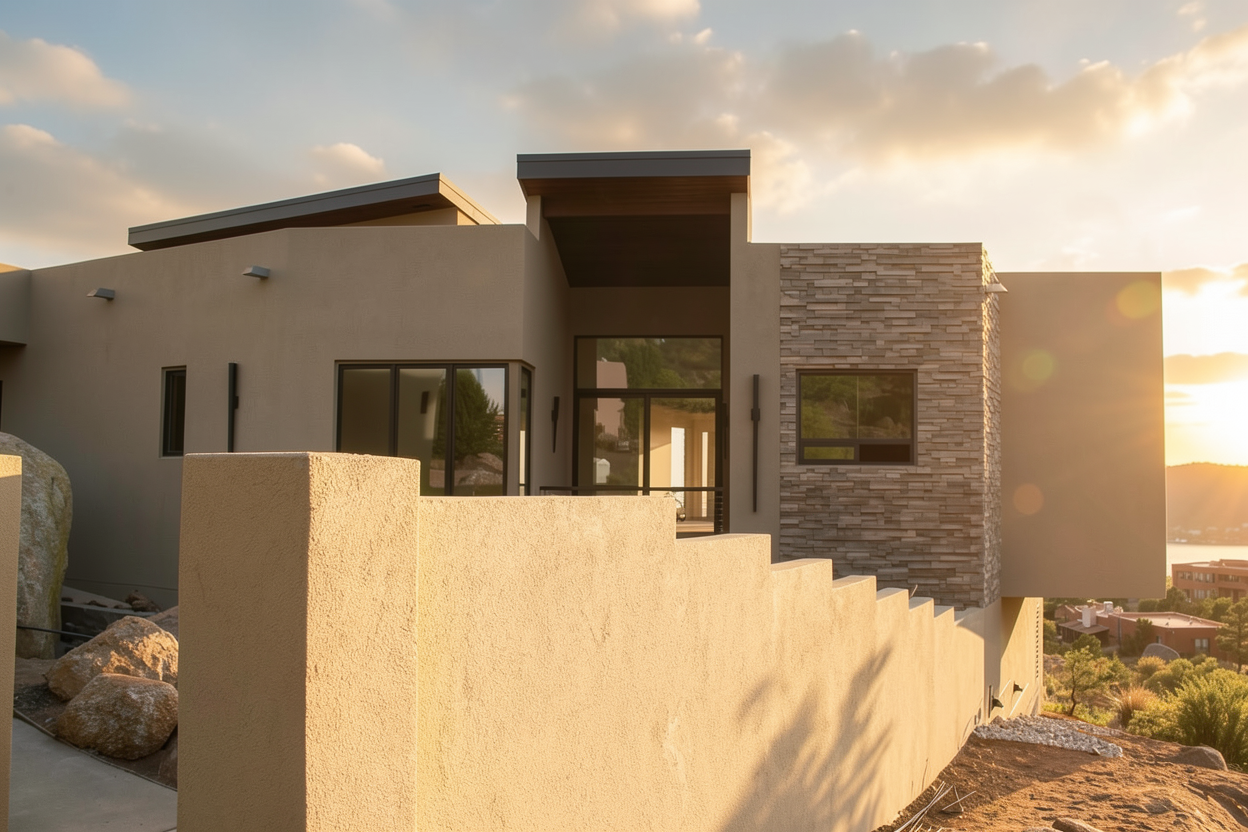 interior design for a a luxury modular house retreat with organic and wavy shaped walls on the right there is a 2 sided fireplace the fireplace has an hardwood countertop that serves as a bar also the bar has two chairs in the back end floor is made from hardwood floor natural tone with cracks and wear areas to look more realistically on the left there is a living room area with a kitchen in back the kitchen has natural wood finish cabinets with led light that have warm light and soft shadows on the left there is the couch and armchairs that have natural earthy tones there is a natural linen carpet under the couch area in front of the couch there is a small coffee table made from natural materials all the interior walls are cladded with a with a bumpy textured surface that looks like sand dunes there are multiple interior lights that set a calm and relaxing tone and also decorative objects to make the place look more relaxing and realistic the suspended lights above the fireplace have wicker lamp shades on the ceiling there are multiple recessed spotlights that cast warm lights and their shadows touch the walls and give a dramatic effect the sunlight comes in from the large left window and has warm light and soft shadows format picture 16 9 extradetailed and ultrarealistic interior all elements have sharp details