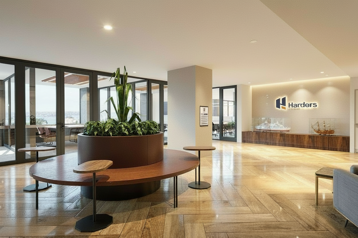 this is an interior render of a back of house kitchen area in an office workplace do not make any adjustments or changes to the existing scene including materials equipment furniture objects lighting etc unless specified by the prompt on the right hand side of the image reduce the intensity of the downlight effect also get rid of the led light strip that is glowing above the harders logo