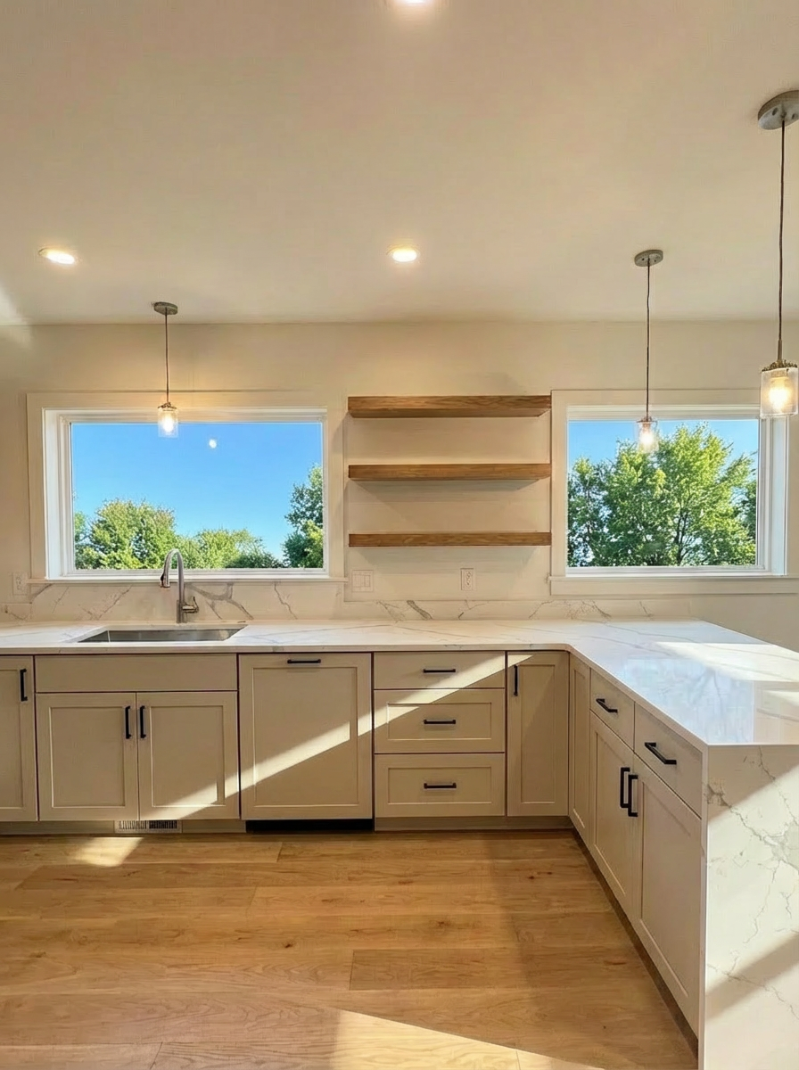do not change the structure layout or window placement of this kitchen replace cabinets with natural wood shaker cabinets