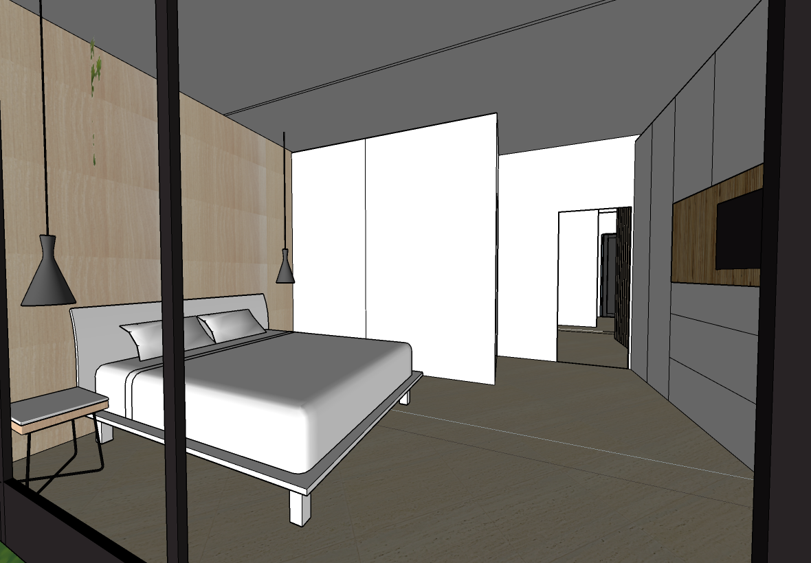 exterior shot a modern minimalist bedroom with an adjacent bathroom large floor to ceiling window bringing in natural light the walls are light wood and soft white the bed has crisp white linens placed on a sleek platform with matching white pillows two elegant black pendant lights on either side of the bed the floor is light oak wooden atmosphere is serene relaxed and luxurious