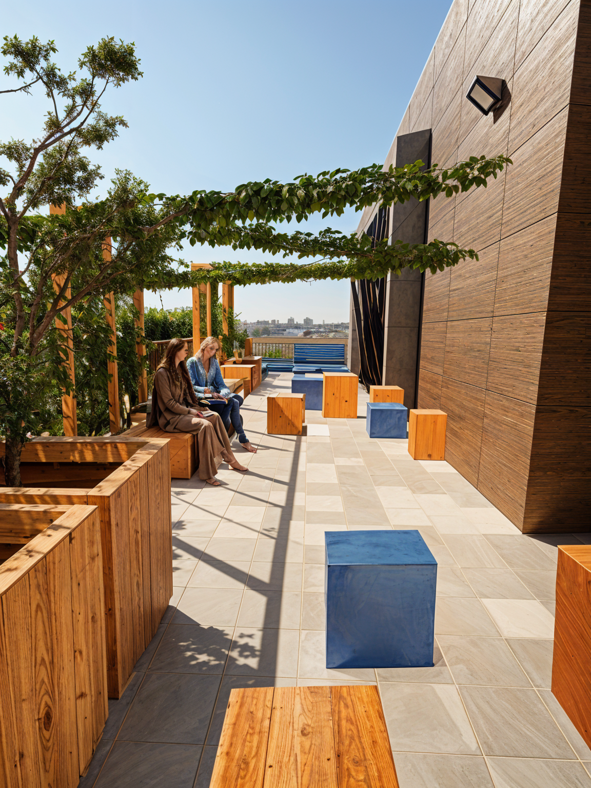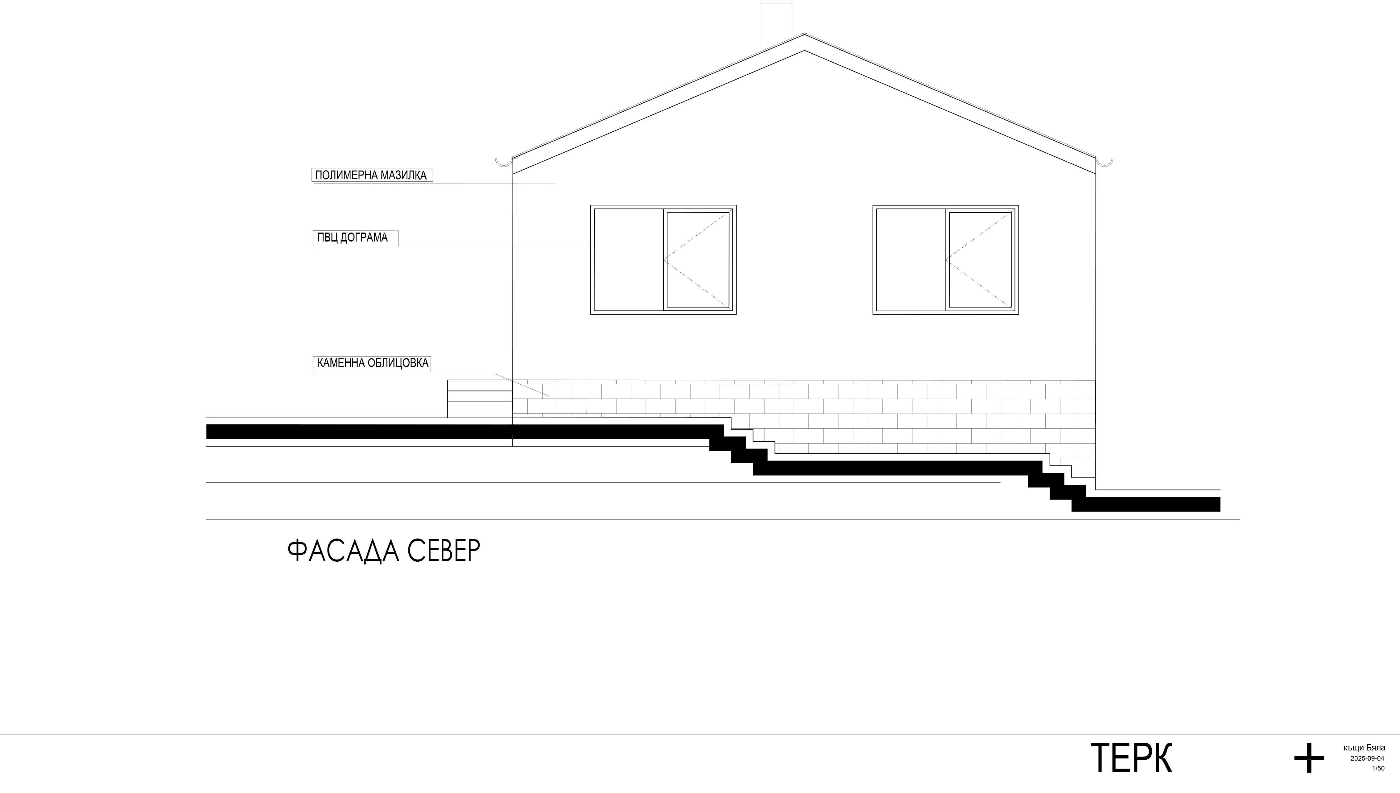 render a modern minimalist house elevation the house features sleek metal roofing in a matte charcoal gray the walls are finished with a smooth polymer plaster in a warm off white shade the windows and door frames are constructed from pvc a subtle light gray to complement the plaster the base of the building is accented with stone cladding in varying shades of light and dark gray the atmosphere is calm and contemporary set against a clear blue sky with soft ambient lighting highlighting the clean lines and materials do not render under the thick black line
