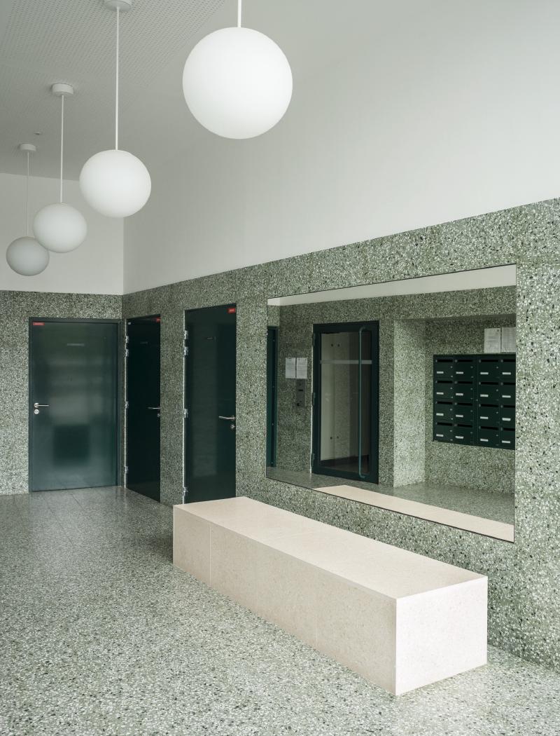 interior shot upgrade interior with green terrazzo floors and walls dark green metal doors and elevator white ceiling minimal lighting with round white pendant lamps clean modern aesthetic high quality render realistic lighting and reflections