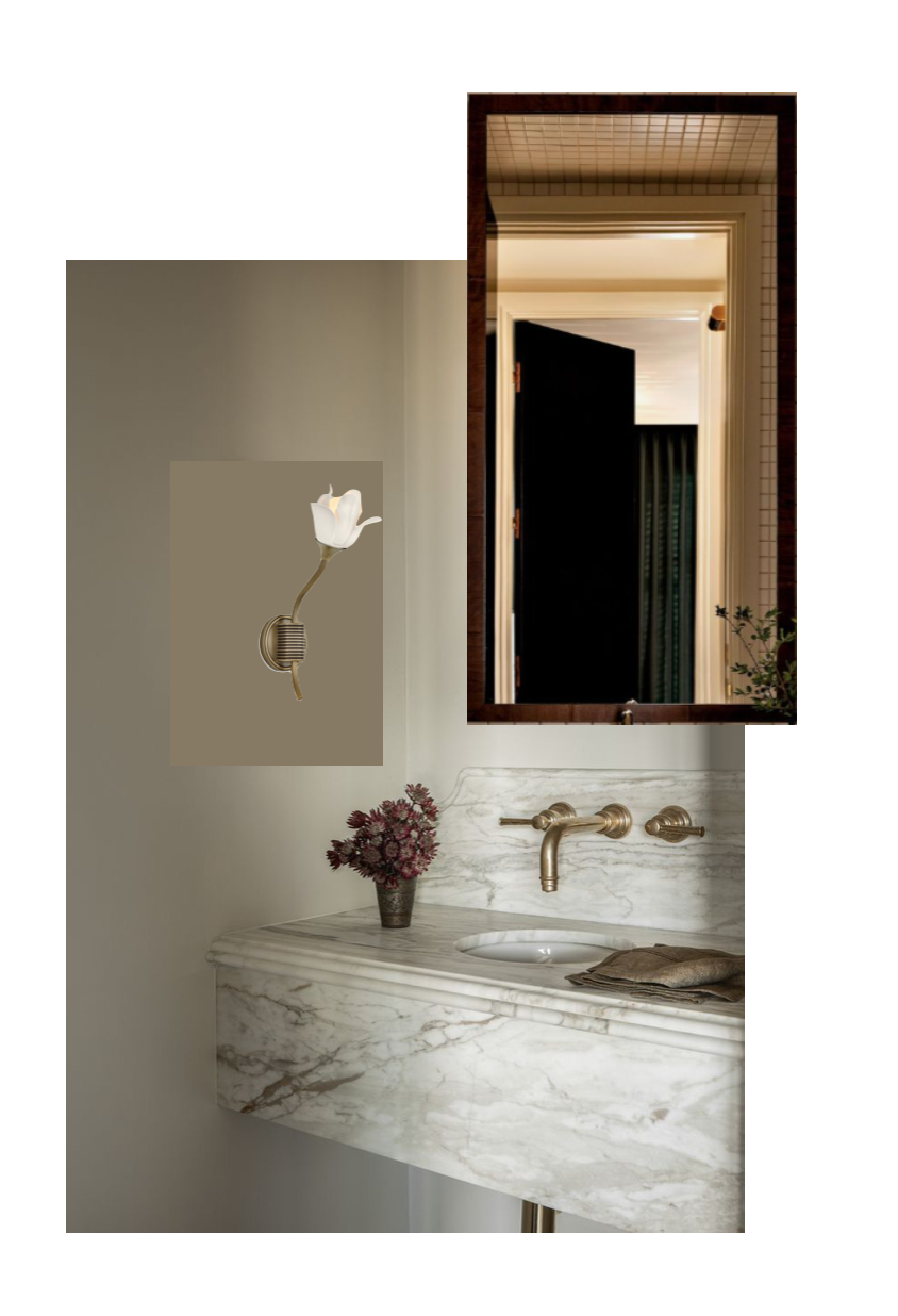 exterior shot create a powder bathroom niche tall and narrow with a wall mounted marble sink floral sconce coming off the wall on both sides wood rectangular mirror grasscloth walls