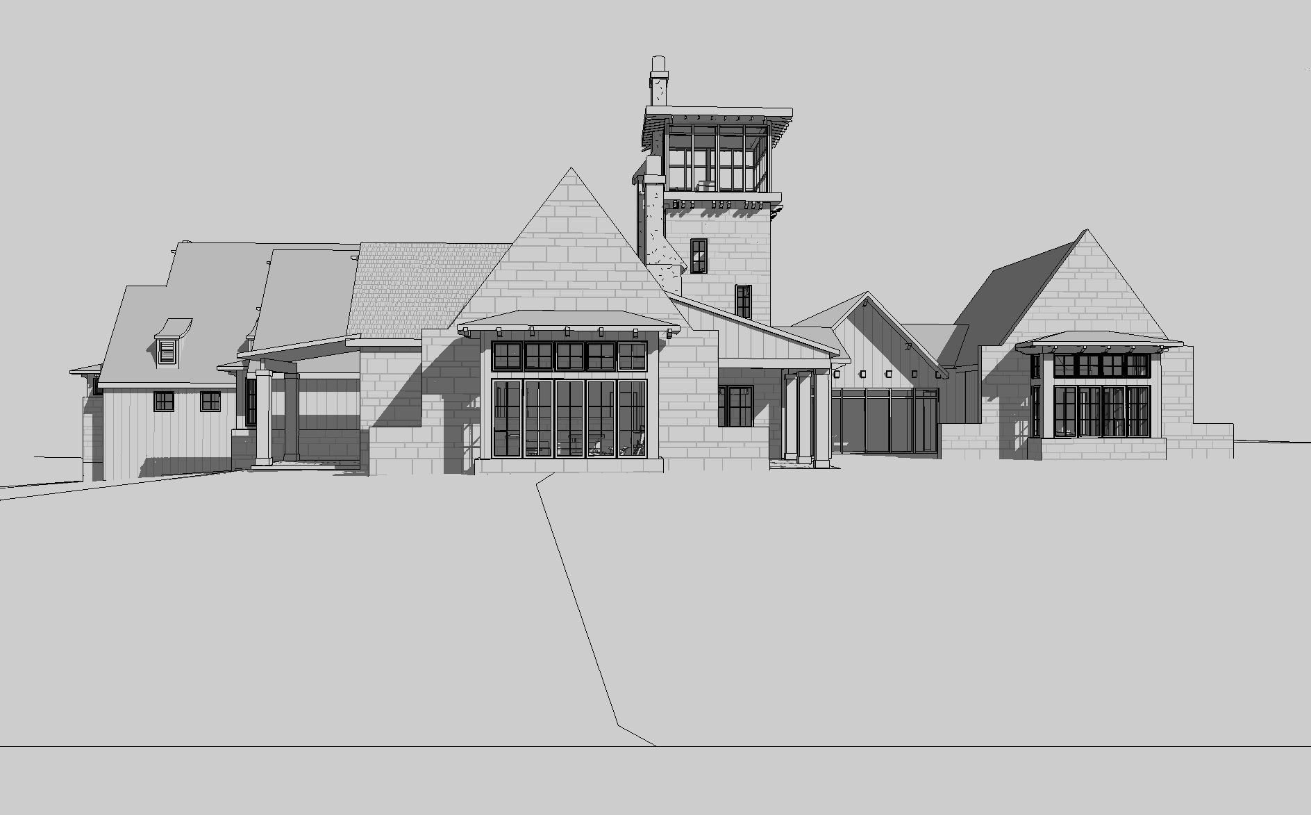modern industrial design coreten steel and concrete panels large glass windows tall grass foreground fog interior lighting trees in the background
