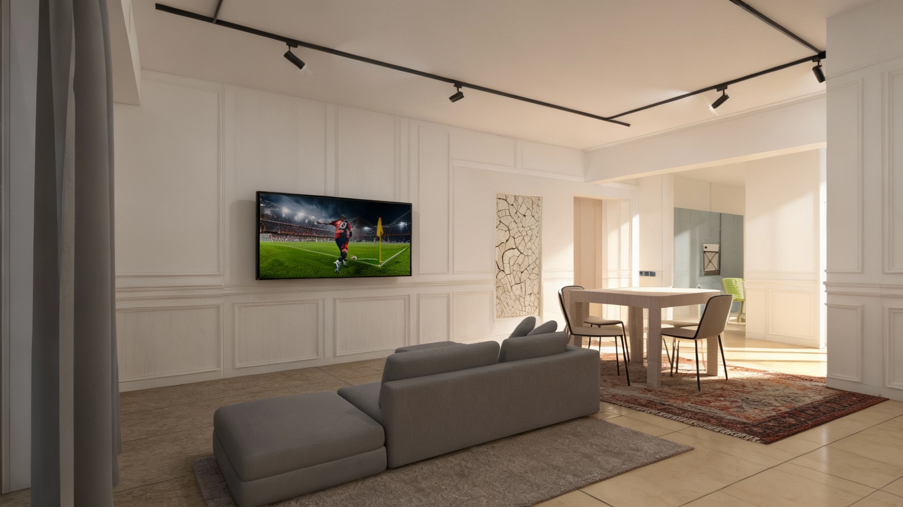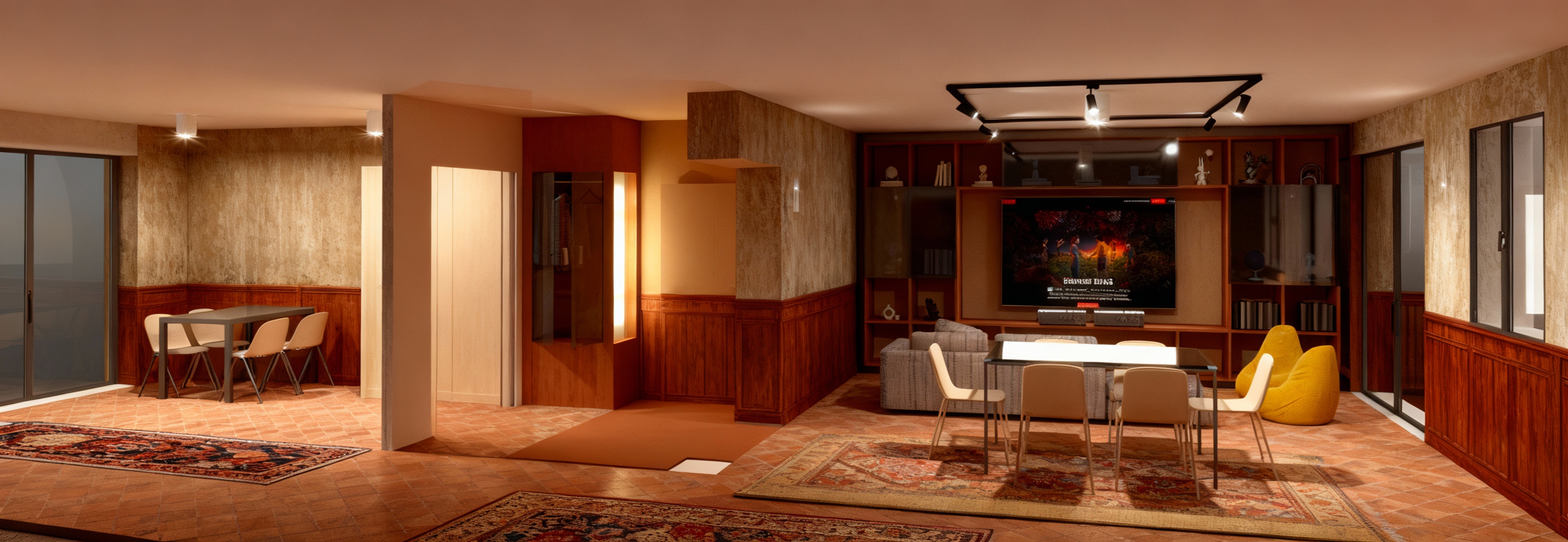 generate a photo realistic image from inside house with bookcase and dining table with surrounding windows and slanted roof that from 2nd floor view the tall trees and mountains maintain a 3 2 aspect ratio for the image