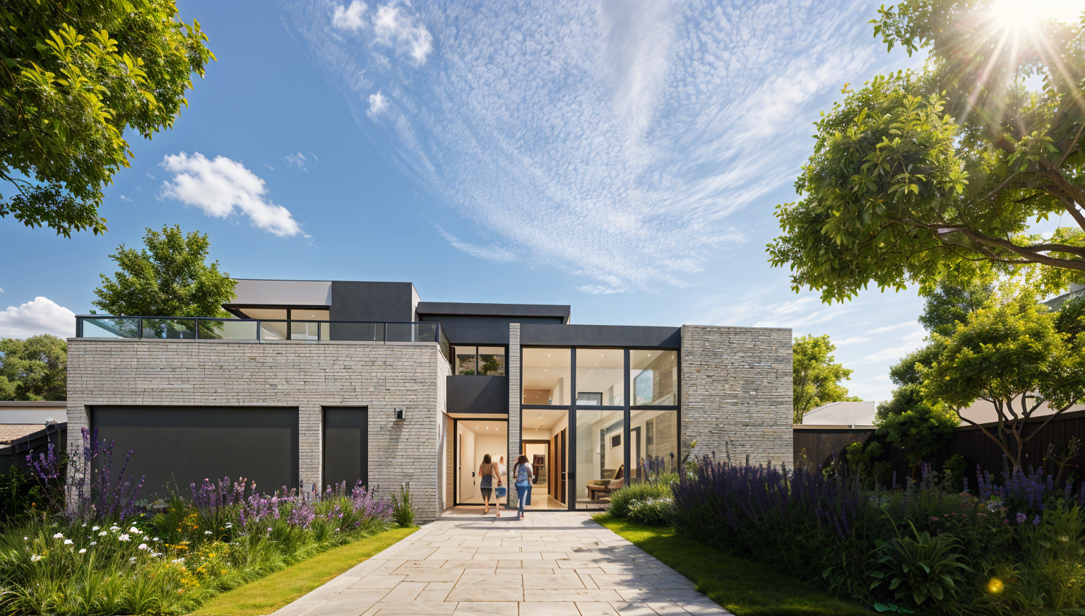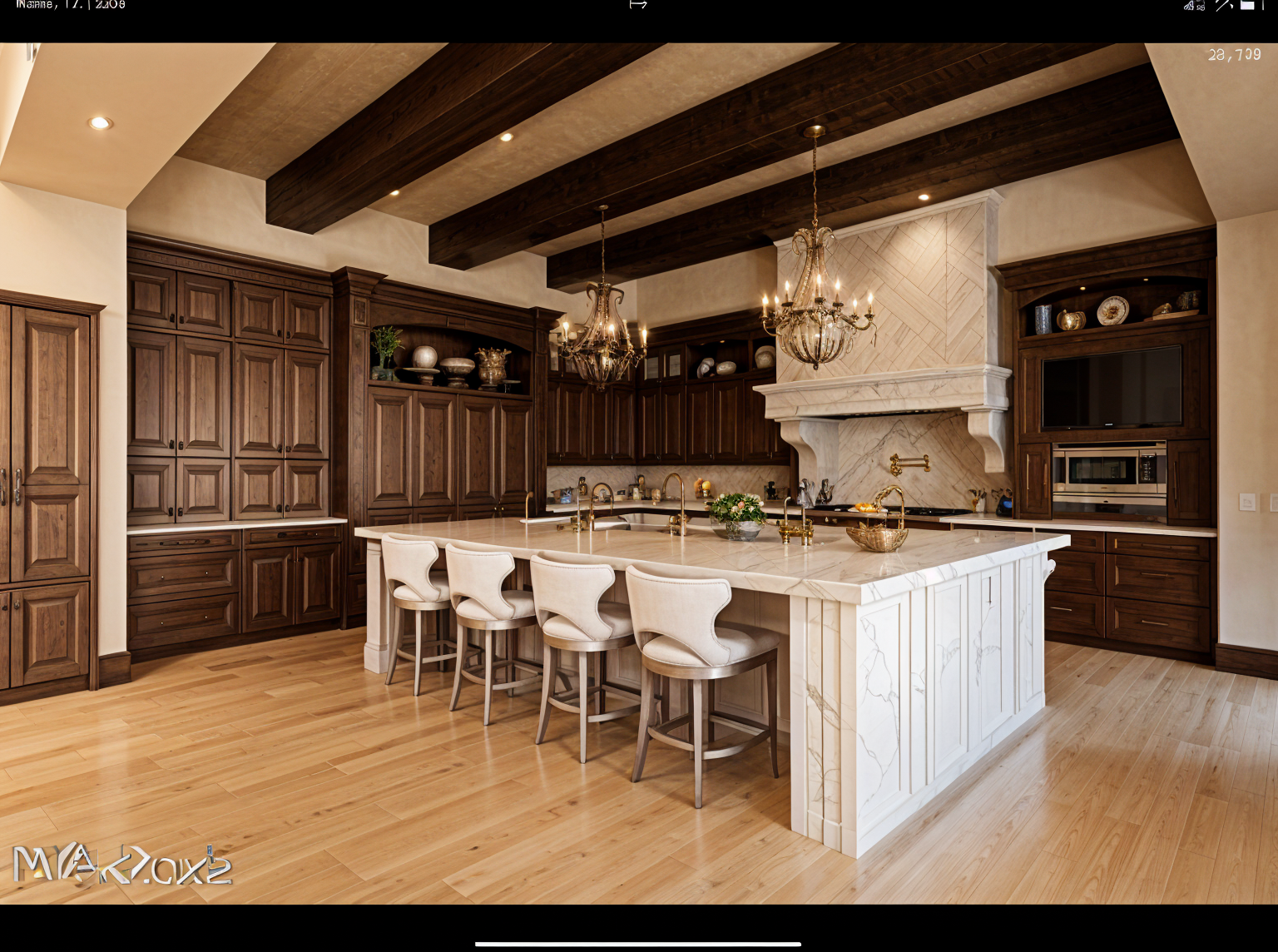 design me a wow factor that is more modern contemporary kitchen island with a waterfall edge design take out all of the ornate pieces the sides of the kitchen island to be a nice waterfall edge made of natural stone that is a cream beige color with nice veining also design me the hood vent to be more modern with the same matching natural stone as the kitchen island make the hood vent more straight and squared