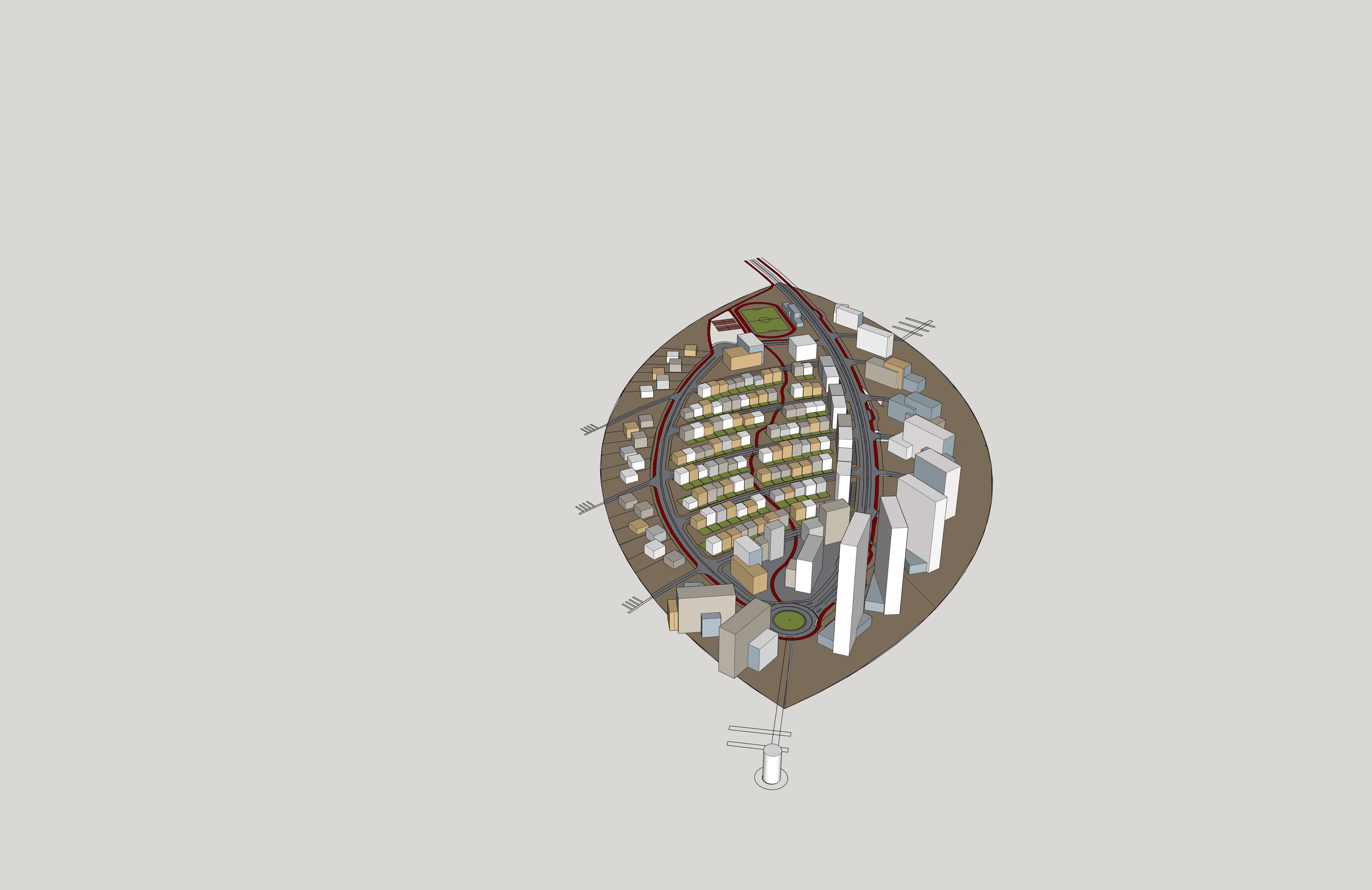 transform this simple sketchup model into a cinematic hyper realistic areal view of a tropical island city keep the overall massing and layout but reinterpret it with modern tropical architecture add row housing retail streets and sports facilities integrated into a lush coastal environment include dense tropical vegetation palms flowering trees coastal plants and layered greenery add beach on the edge of the island marinas for boats to dock detailed street furniture such as benches shading structures planters bike racks lighting and wayfinding populate the scene with cars on he roads diverse people walking shopping exercising and relaxing use warm natural light soft atmospheric haze and a high end filmic look