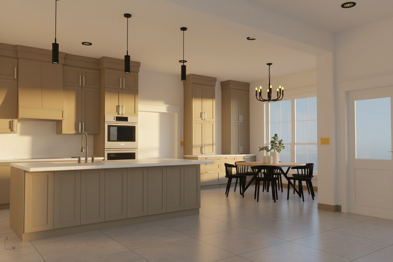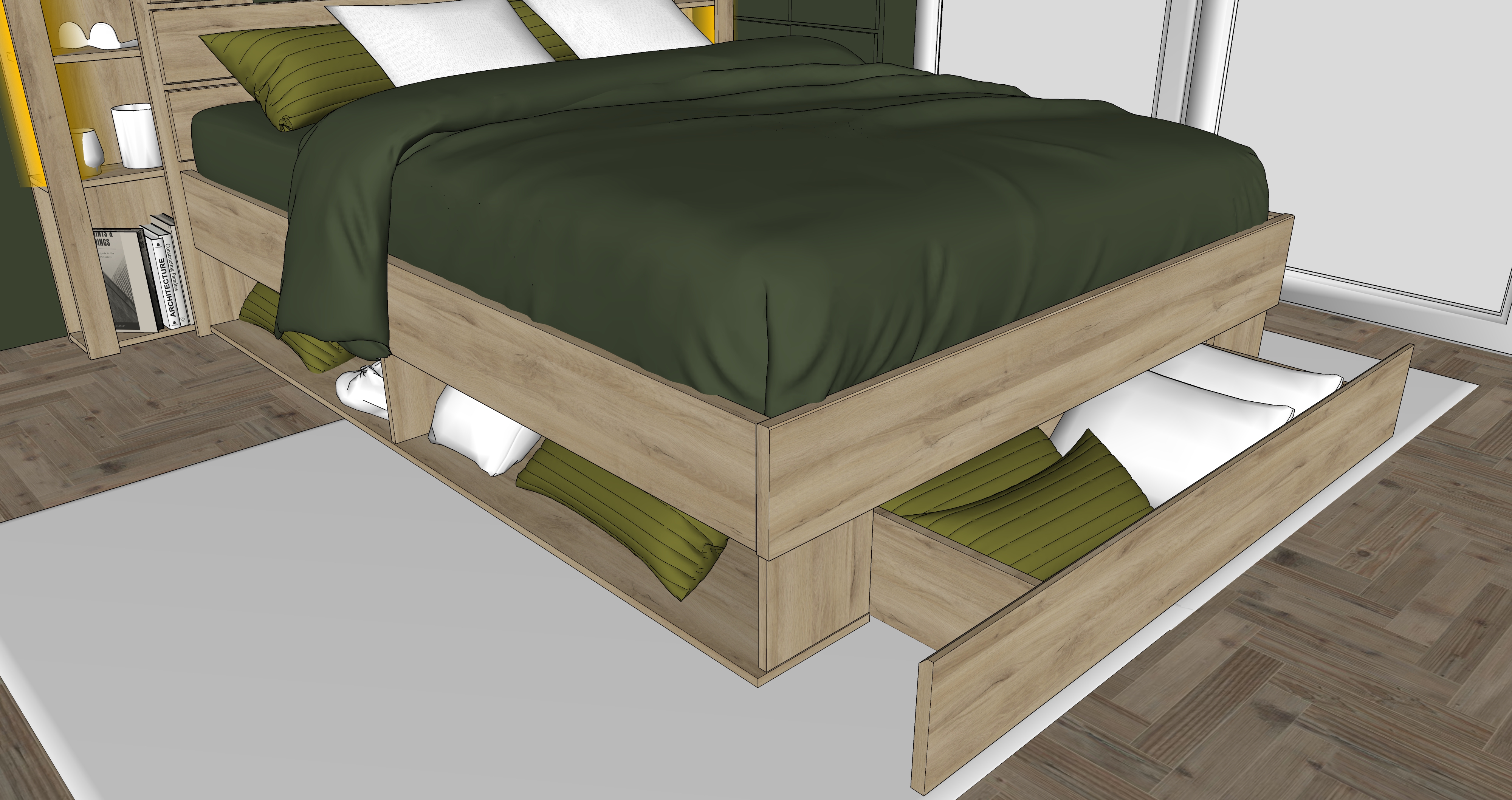 chambre moderne et chaleureuse au design naturel grand lit avec drap beige couvertures vert fonc et coussins assortis mur d coratif vert textur plantes tombantes fix es en hauteur suspensions avec ampoules vintage en verre sol en bois clair grand tapis gris chaussures dans les niches basses du lit ambiance cosy style contemporain et minimaliste clairage doux et r aliste rendu photor aliste haute r solution