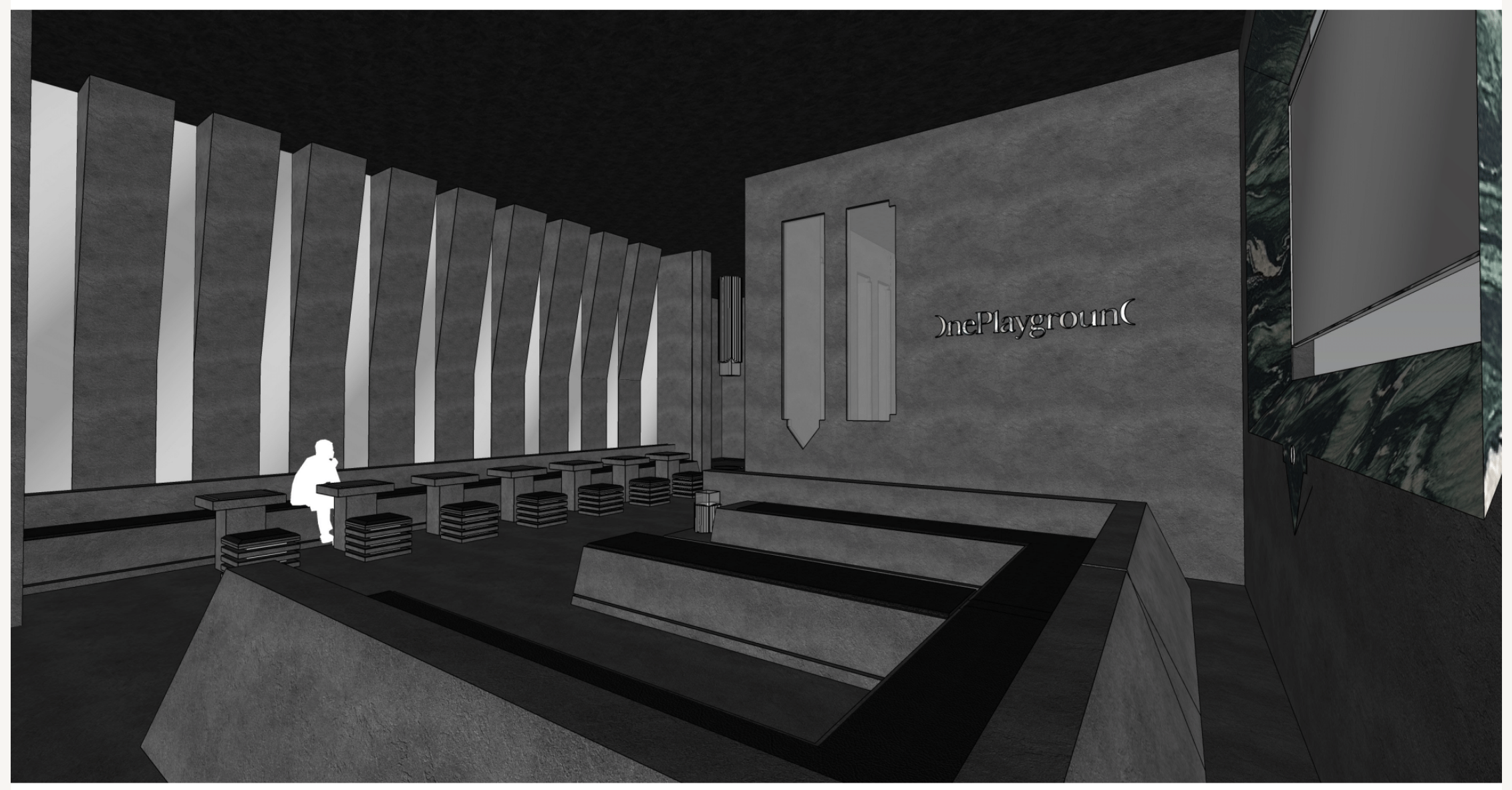 photorealistic architectural render of the provided sketchup model strict mode preserve the exact architecture geometry proportions walls columns counters seating layout and signage exactly as modeled do not add remove or modify architectural elements only enhance materials lighting and atmosphere project one playground ryde basement lobby arrival space lighting this is a fully underground gym lobby with no natural light lighting should feel dramatic sculptural and atmospheric similar to a luxury wellness retreat or cinematic hotel lobby create strong architectural uplighting washing the vertical fins along the left wall soft concealed led lighting under benches and platforms subtle grazing light across the concrete plaster walls to reveal texture a feature pendant light glowing above the central space deep shadows and contrast overall lighting mood should be low key and cinematic not bright commercial gym lighting materials walls architectural microcement or plaster finish in a deep neutral tone columns vertical fins monolithic architectural concrete or stone with soft texture floor dark premium rubber gym flooring with matte finish reception desk sculptural minimal heavy architectural form with refined plaster or stone finish stone accents the green marble elements should appear luxury polished marble with strong veining and depth subtly reflective atmosphere the space should feel like descending into a powerful underground training sanctuary mood references aman spa high end wellness architecture cinematic luxury gym environments dramatic quiet powerful subtle haze in the air to catch light beams and enhance depth branding the one playground sign on the wall should appear as refined metallic lettering softly lit by wall grazing light camera maintain the exact same camera position and composition as the model view quality ultra realistic architectural photography high dynamic range dramatic shadow depth premium materials cinematic atmosphere