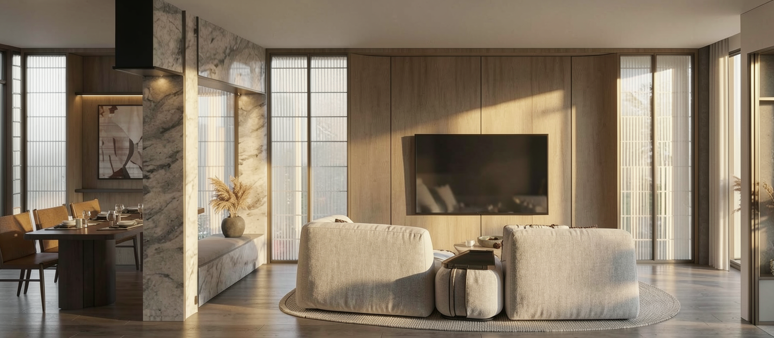 a model of a house add few rees in background for context add very few bt neat vegetation with floral ones for context too the upper walls should be beidge light brownish retaining the three horizontal key lines give picture sunsety vibe 3 4 p m add creamish interior ighting very faint balcony you see on left side is glass
