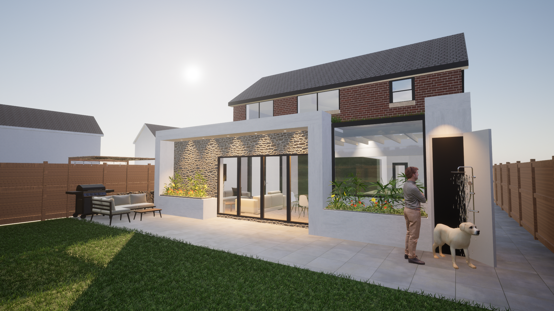 add more patio furniture and landscaping replace people and dog with more realistic versions add a mum and a child playing