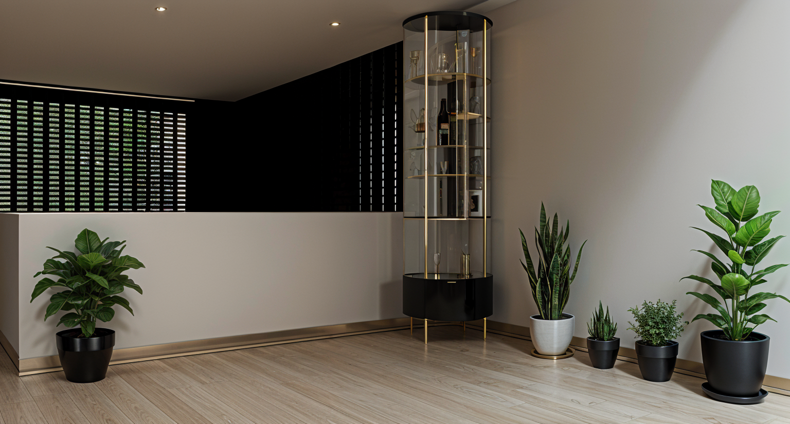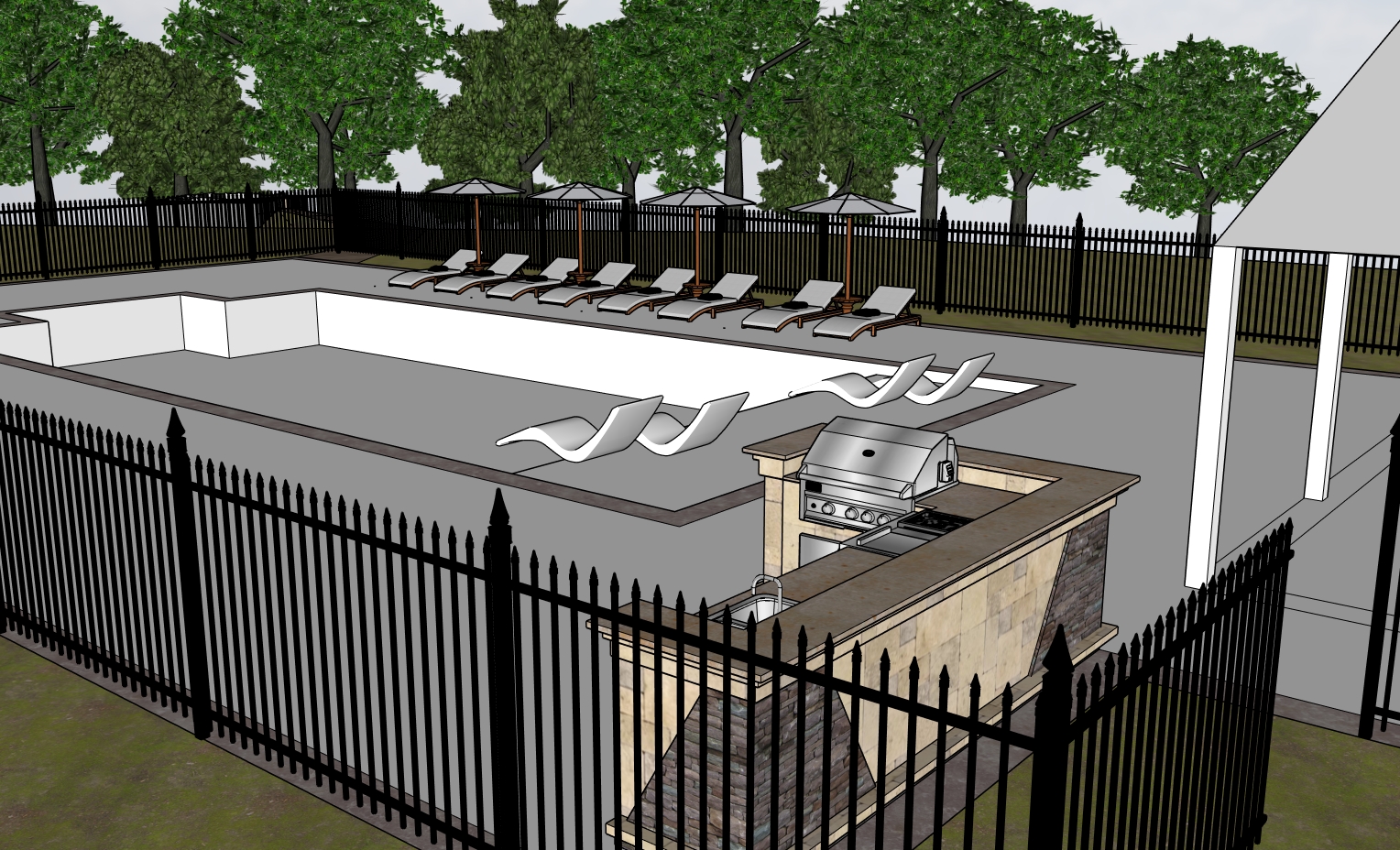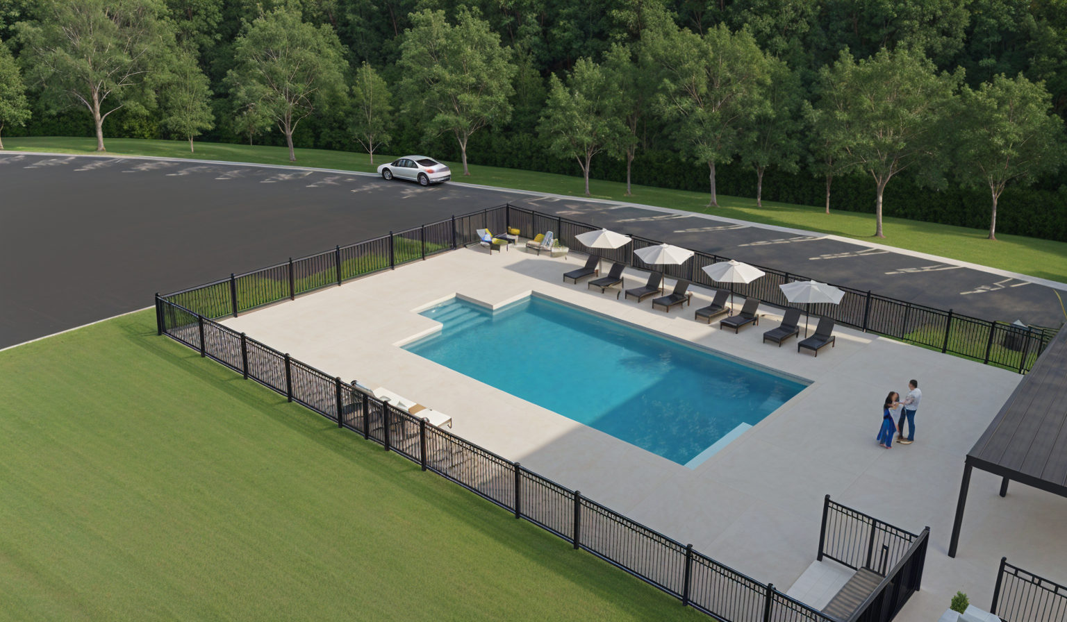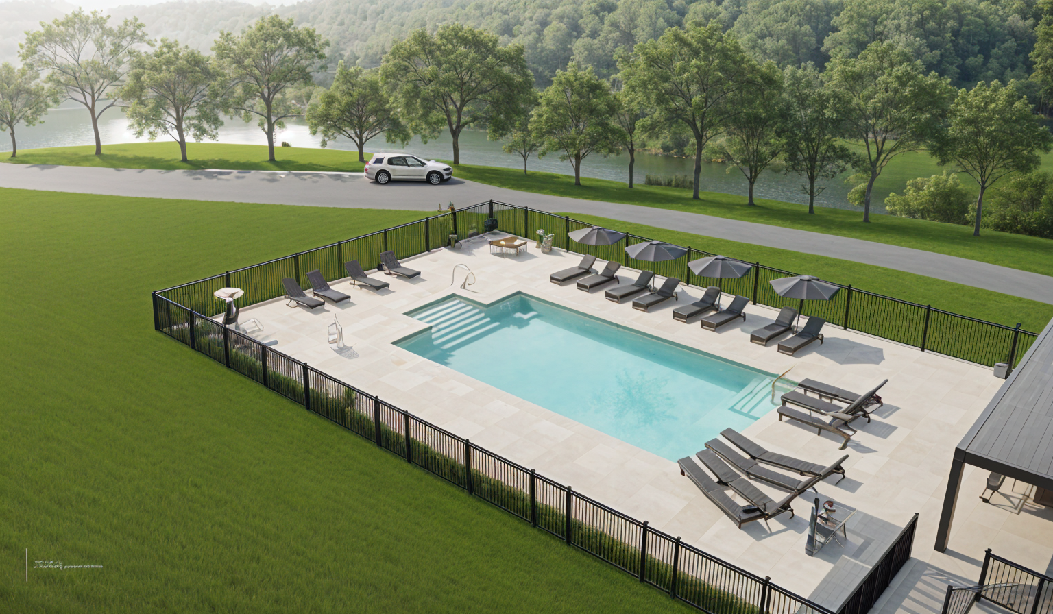 render a community pool setting with the following features maintaining the design elements and layout shown in the reference image pool and deck surround the entire pool with a smooth concrete deck as shown include multiple modern lounge chairs arranged along the long side of the pool each paired with a large umbrella on the opposite end of the pool place several in pool loungers partially submerged on the shallow step shelf fence and enclosure enclose the concrete pool deck with a black metal picket fence consistent in height and style with the reference picture provide at least one gated access point connecting to adjacent walkways and site features pool house and outdoor kitchen add a pool house structure near the corner of the pool with a simple pitched roof and open bays topography and slope situate the pool area on top of a gentle slope that descends away from the fence beyond the slope show a forested area with mature trees extending toward a river below fire pit area at the upper portion of the slope overlooking the pool and forested slope include a fire pit area with seating railing and decking parking lot beside the pool enclosure include a paved resident parking lot with marked parking spaces drive aisles and curbing matching the reference image show a few parked cars to convey residential use site and atmosphere keep the landscape natural with grassy open areas around the fenced pool deck and dense tree canopy over the slope depict daylight conditions with soft natural shadows maintain all proportions dimensions and placements consistent with the provided reference architecture