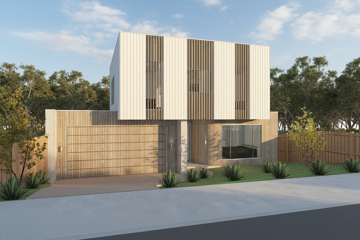 exterior walls uses a combination of off white limestone and dark gray pvc planks dark silver aluminum cladding for ceiling main door in kamagong solid wood