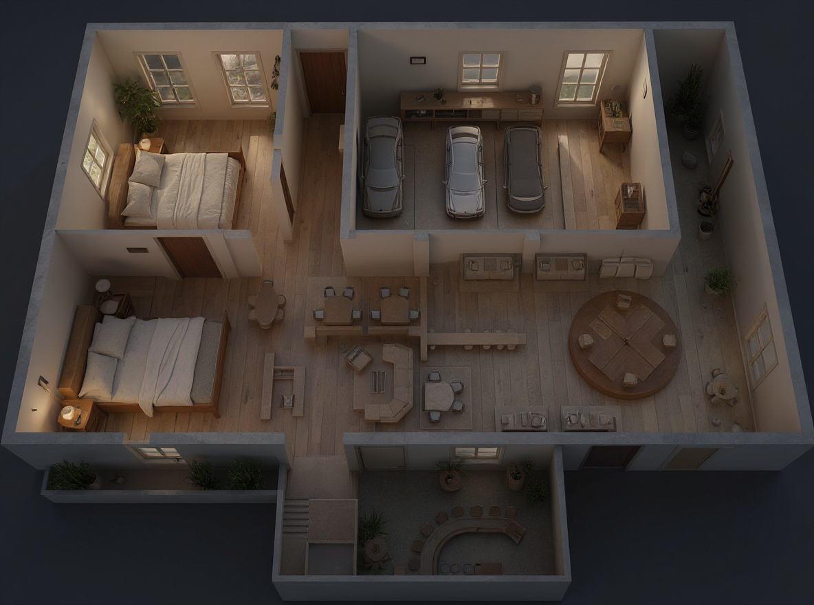 show stair handrail to be light wood with metal cable and metal posts at side of stair
