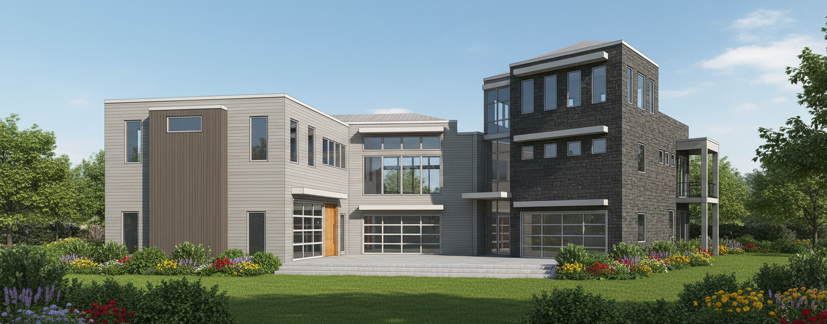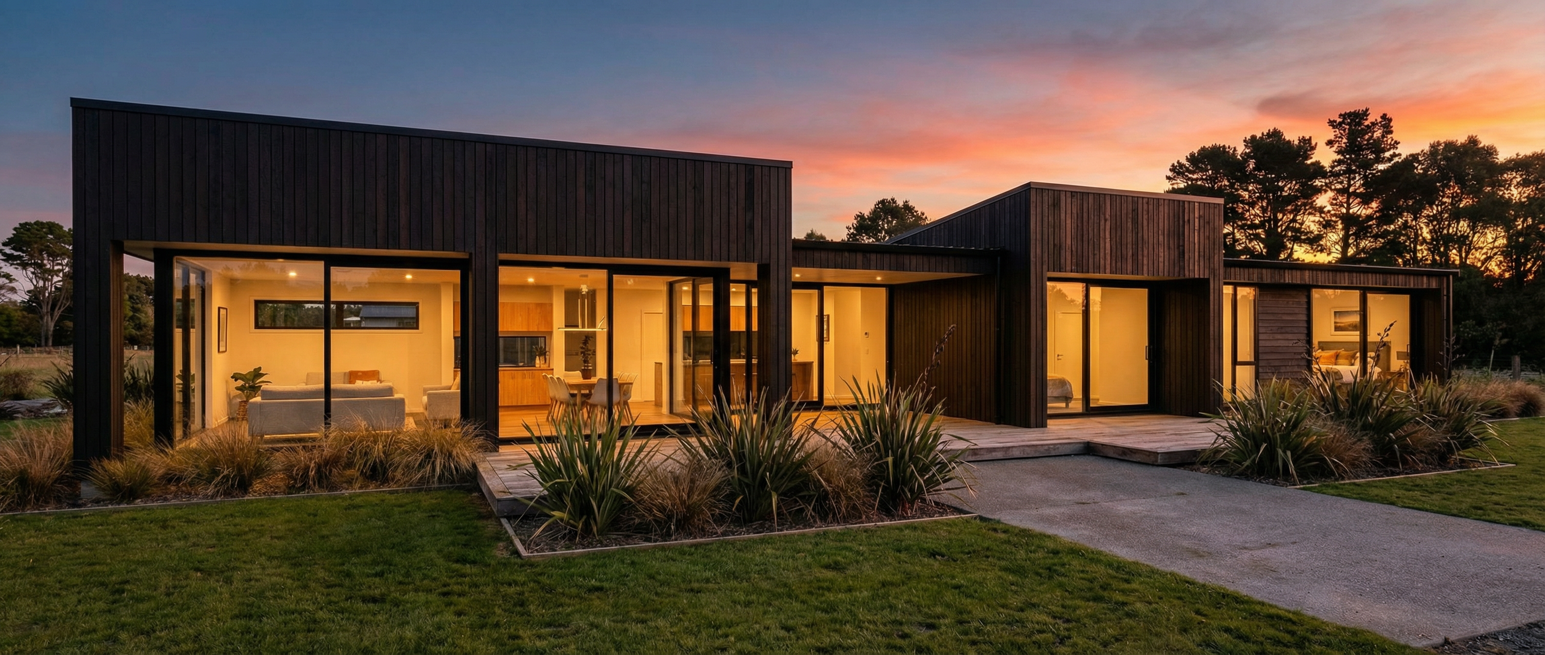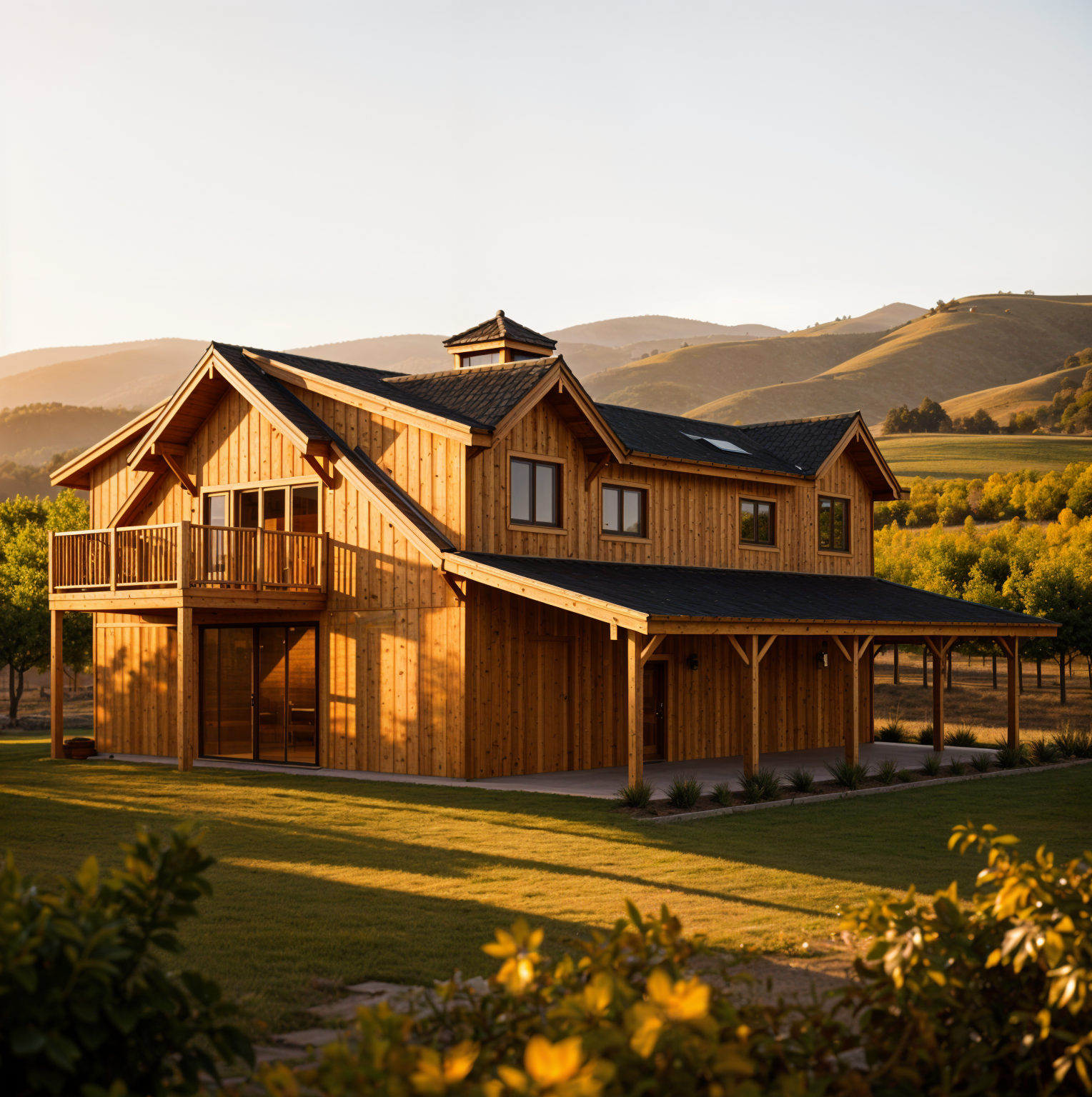 clean timber clad architectural exterior rendered in cinematic golden hour lighting vertical wood siding dark roof winery vines in the background sonoma area natural wood textures high fidelity photorealistic visualization crisp shadow falloff refined fa ade geometry richly detailed grain patterns soft atmospheric depth subtle lens bloom calm minimal landscaping premium architectural photography mood ultra clean composition and materials dark roof wood barn doors wood man door on the side of the structure