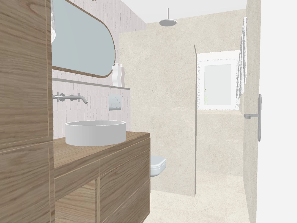 minimalist modern bathroom interior with a light airy atmosphere the walls are a soft beige with a subtle texture the sink area features a sleek white round basin atop a natural light wood vanity adding warmth to the space the faucet is a contrasting metallic silver a large oval mirror with a thin silver frame hangs above the sink reflecting ambient light the shower area has a simple modern rain shower head the floor tiles are a slightly darker shade of beige for a cohesive look soft natural light filters through a small window creating a calm inviting atmosphere