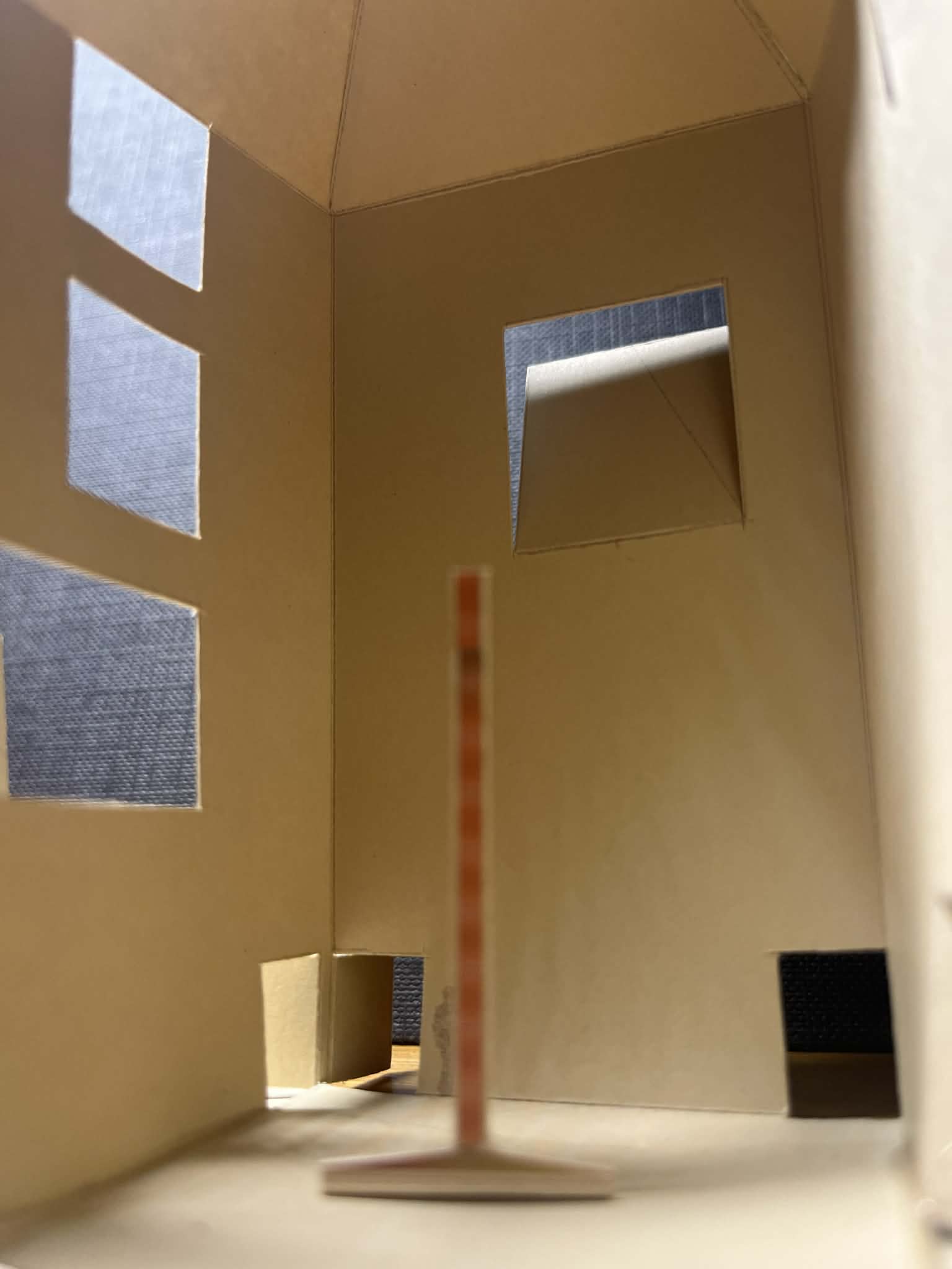 espacio de 4 alturas con balcones con barandilla de vidrio en el lado izquierdo y un lucernario por el que entra la luz en la pared del fondo el suelo es de tarima de roble con tablas paralelas a la pared del fondo en el centro de la estancia hay un cilindro cer mico rugoso de color gris oscuro con una base c nica circular del mismo color que acaba con muy poco espesor en el contacto con la tarima