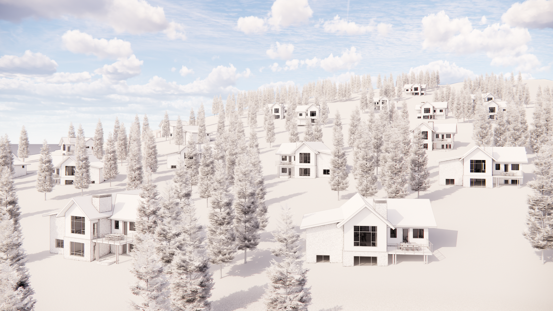 grainy washed out watercolor render of timber frame building with faded reclaimed wood siding and stone base cedar shake roof with snow watercolor trees and mountain environment in the background extensive watercolor landscaping surrounding the building