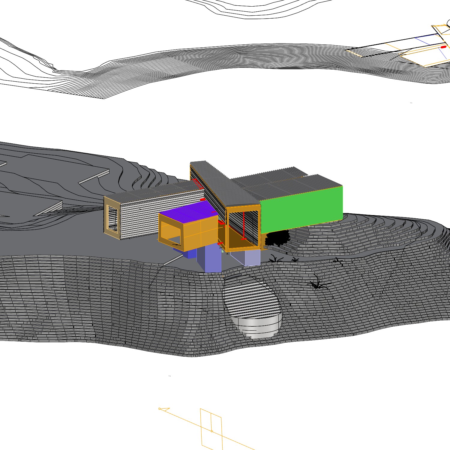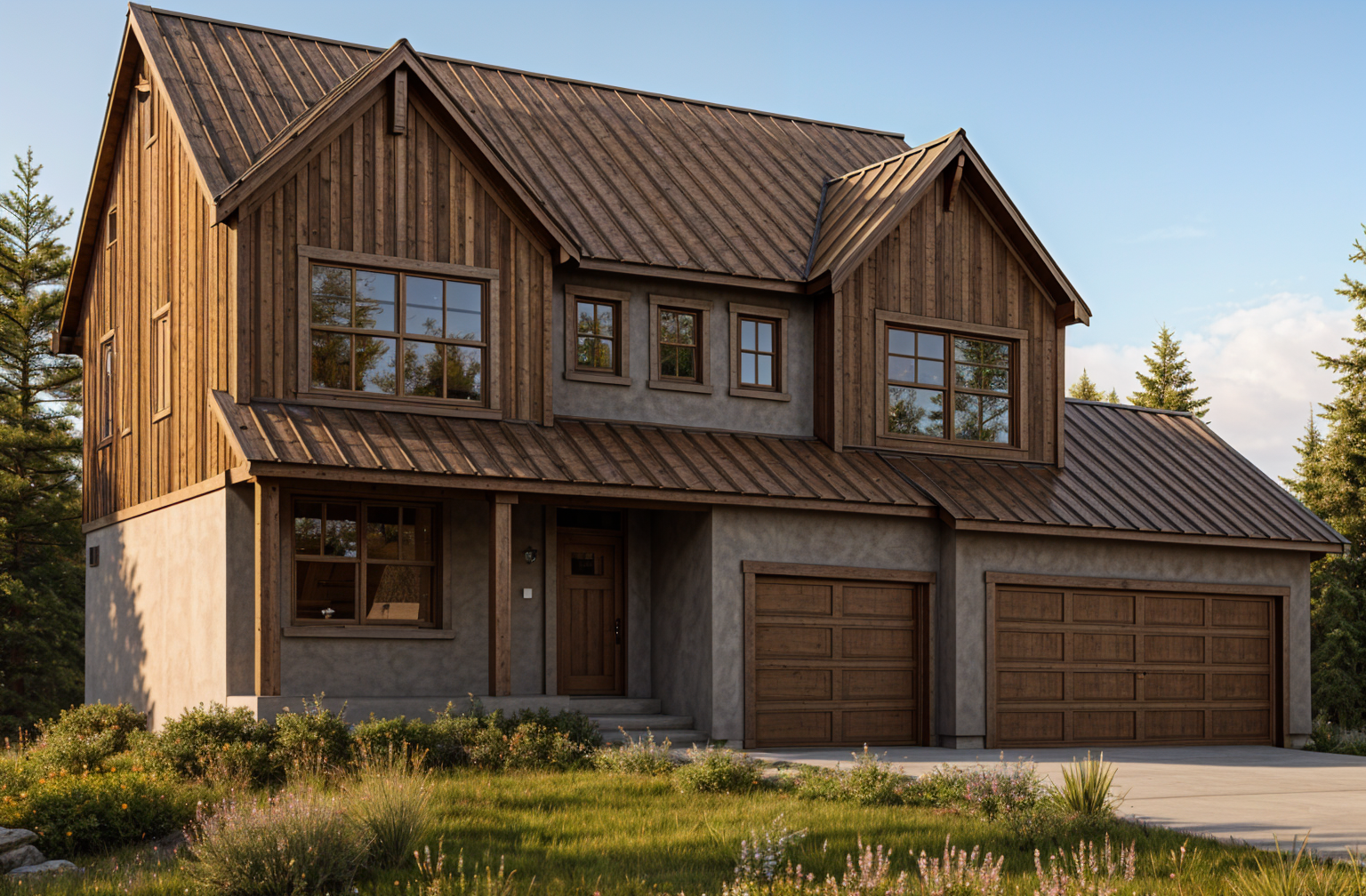 render the building in this image with soft textures the roof is a corrugated metal roof the walls are metal panels look rustic render the image so it architectural dimension overlay make it look like a technical sketch