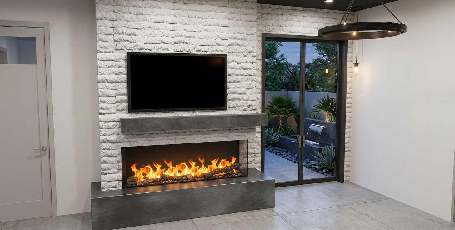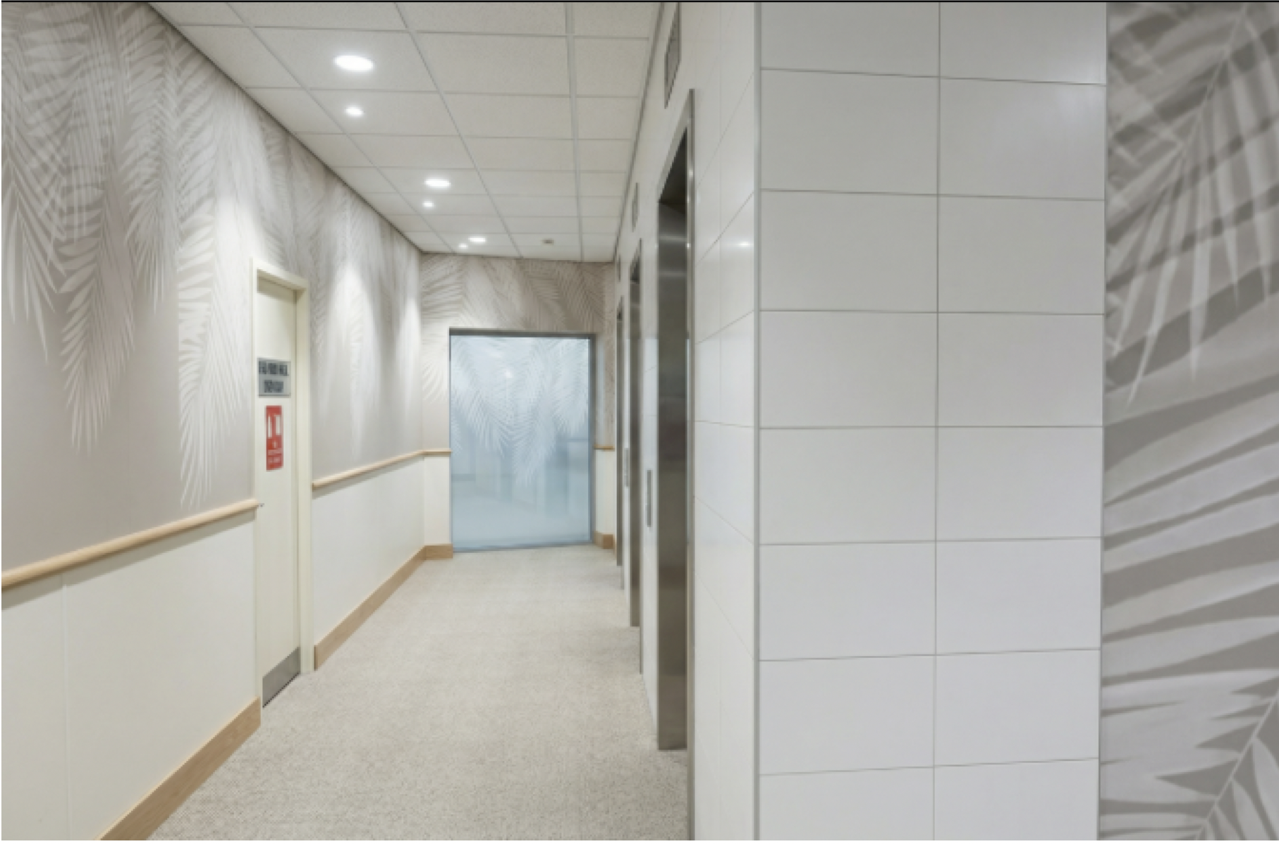 create a photorealistic view of a lift lobby using the reference image and cool white led downlights offset to the left in the ceiling keep all the architectural features the same including the 3 lift doors and the wallpaper on the panel on the right hand foreground the wall on the right hand side where the lift doors are has white rectangular ceramic tiles on the wall and into the lift recesses the lift doors and lift door frames are brushed stainless steel the wall continues straight towards the sliding glass door at the end of the corridor the single glass door at the end of the lift lobby will have a transparent monochromatic image of palm trees to match the wallpaper the floor will be a grey flecked carpet the other walls will have off white pvc sheeting from floor to dado height of 1m these walls will have a light timber dado rail at 1m high and a light timber skirting on the walls above the dado will be a mural as shown in the image the door on the left will have pvc sheeting in off white at the bottom to a height of 1m and will be painted in off white paint above there are signs as per the image on the door led lights are cool white