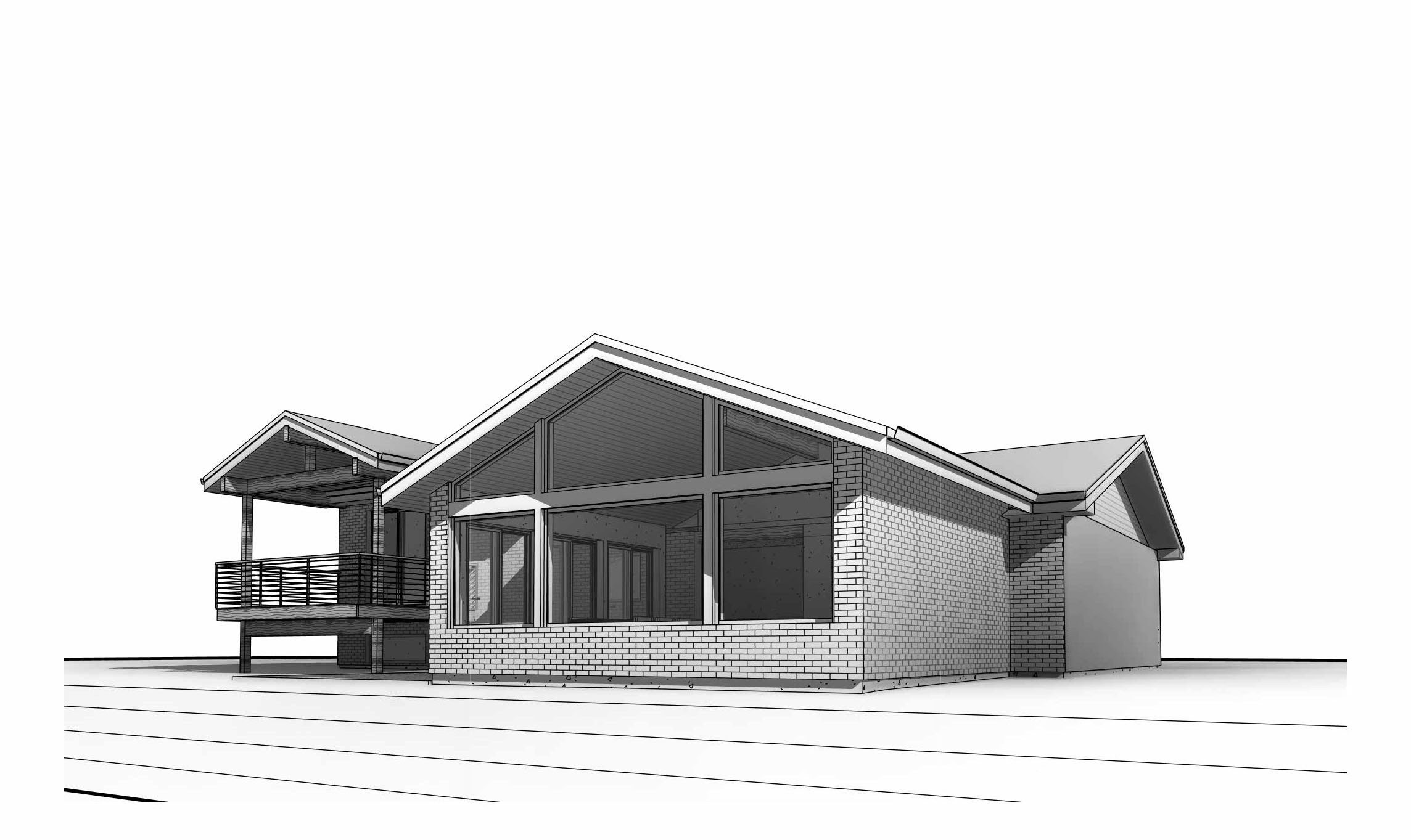 the house sits up on a small grassy hill and on the right side located in the foreground and at the bottom of the hill there is a large oak tree there is a neighbor to the left and we can see the side of their garage there is a 6 foot tall wood fence separating the house from the neighbor the house is clad in red brick the windows have black window frames and reflective glass the roof eave trim and gutters are painted white and there is a black shingle roof exposed structural posts beams and framing are stained dark brown and there is a black iron railing around the porch the time of day is sunset and there are clouds in the sky above the house there are snow capped mountains