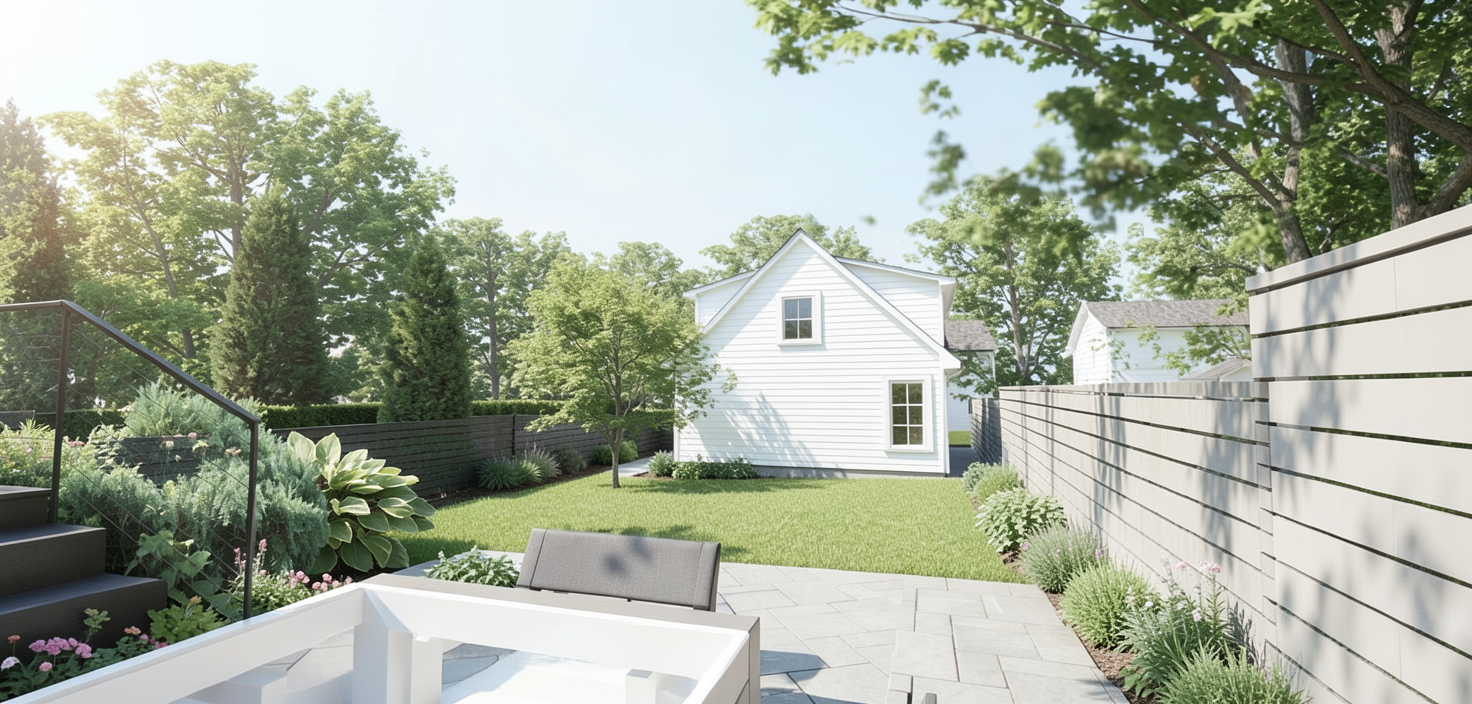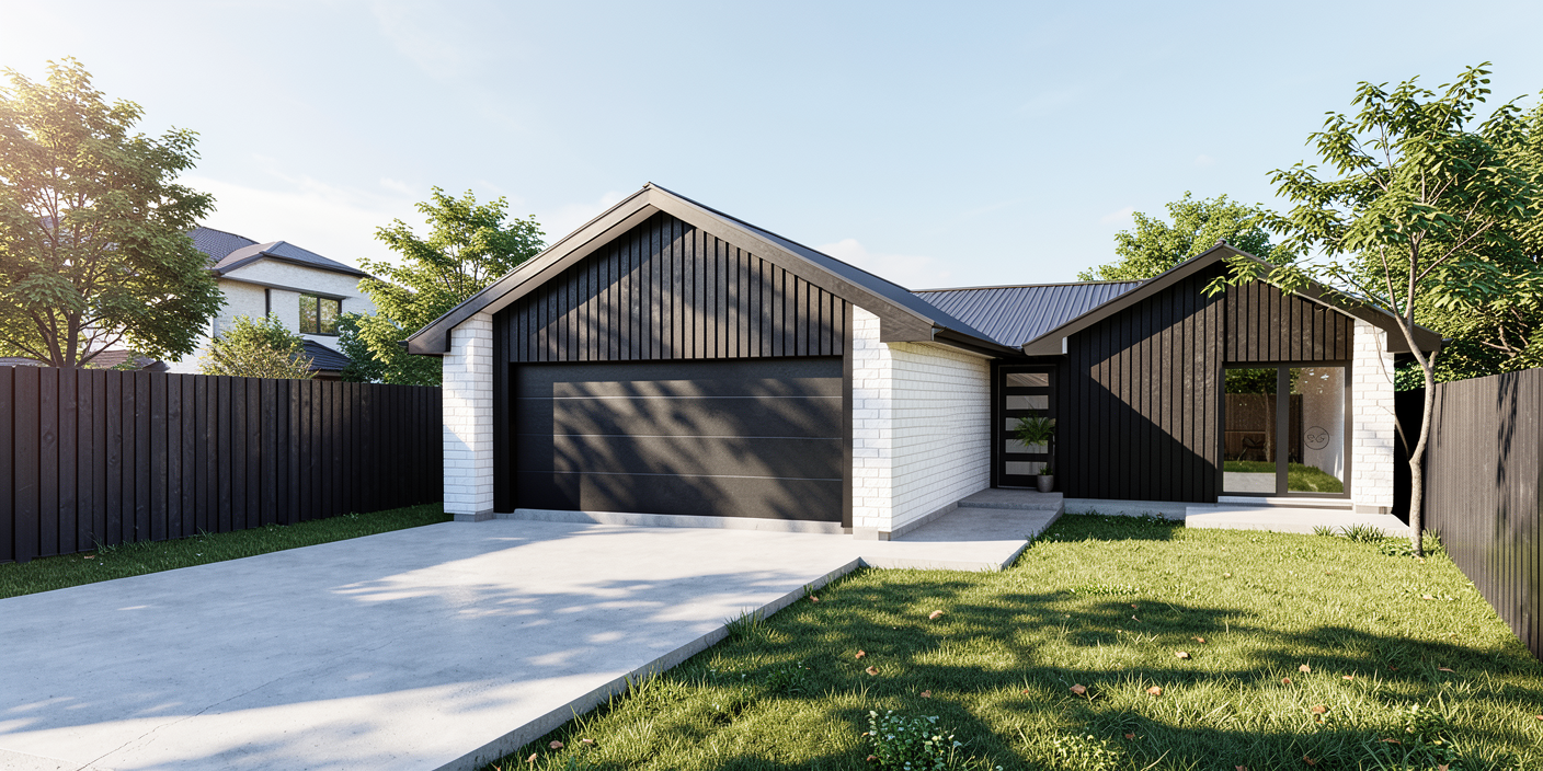 afternoon lighting large oak and maple trees in background white brick house with white windows carriage style wood garage doors low shrubs at house