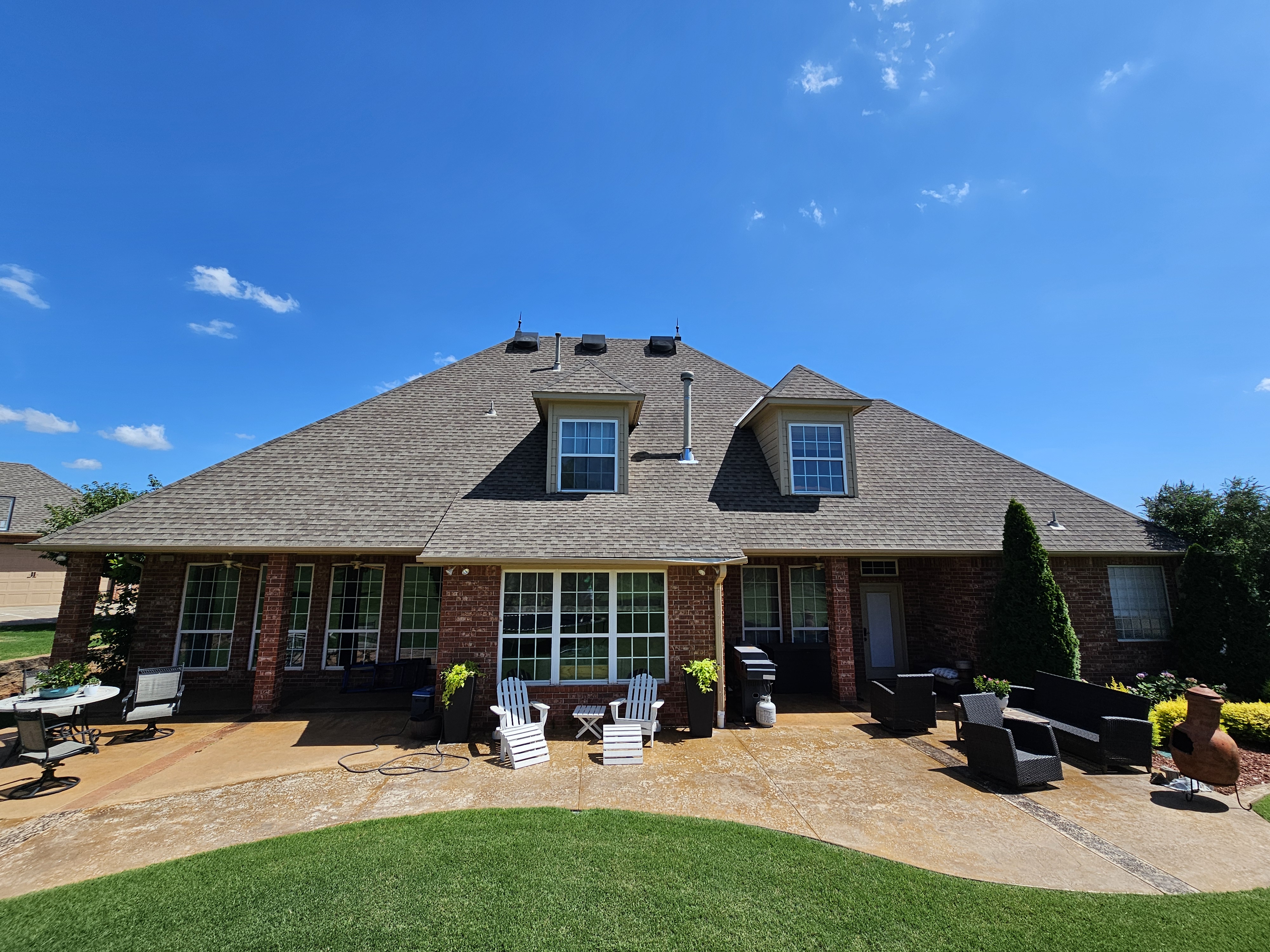 make the left patio a vaulted ceiling change the upstairs windows into doors and make them exit onto a 2nd story balcony the right patio should be an outdoor kitchen architecture