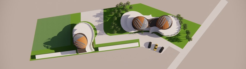 make a realistic aerial perspective of this office building showing the roof or top part of the buildings only with the landscape