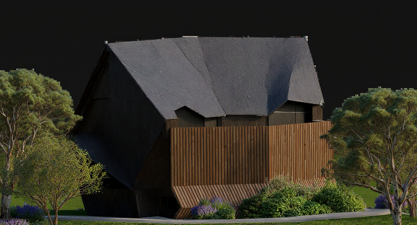 render the building in this image with soft texture the roof is a grey metal panel roof the walls are textured white render the image so it architectural dimension overlay make it look like a technical sketch please no measurment tags anywhere the slip for the roof in front slopes backwards and the slope for the semi cricle slops down as well make some cement stairs to sit in the circle