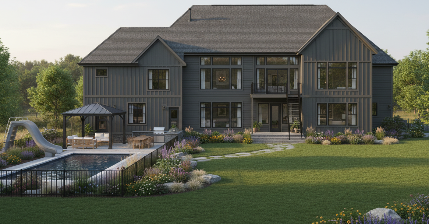 render the elevation on the left in the same style as the render on the right bright and airy and as ralistic as possible make the ratio and scale the same