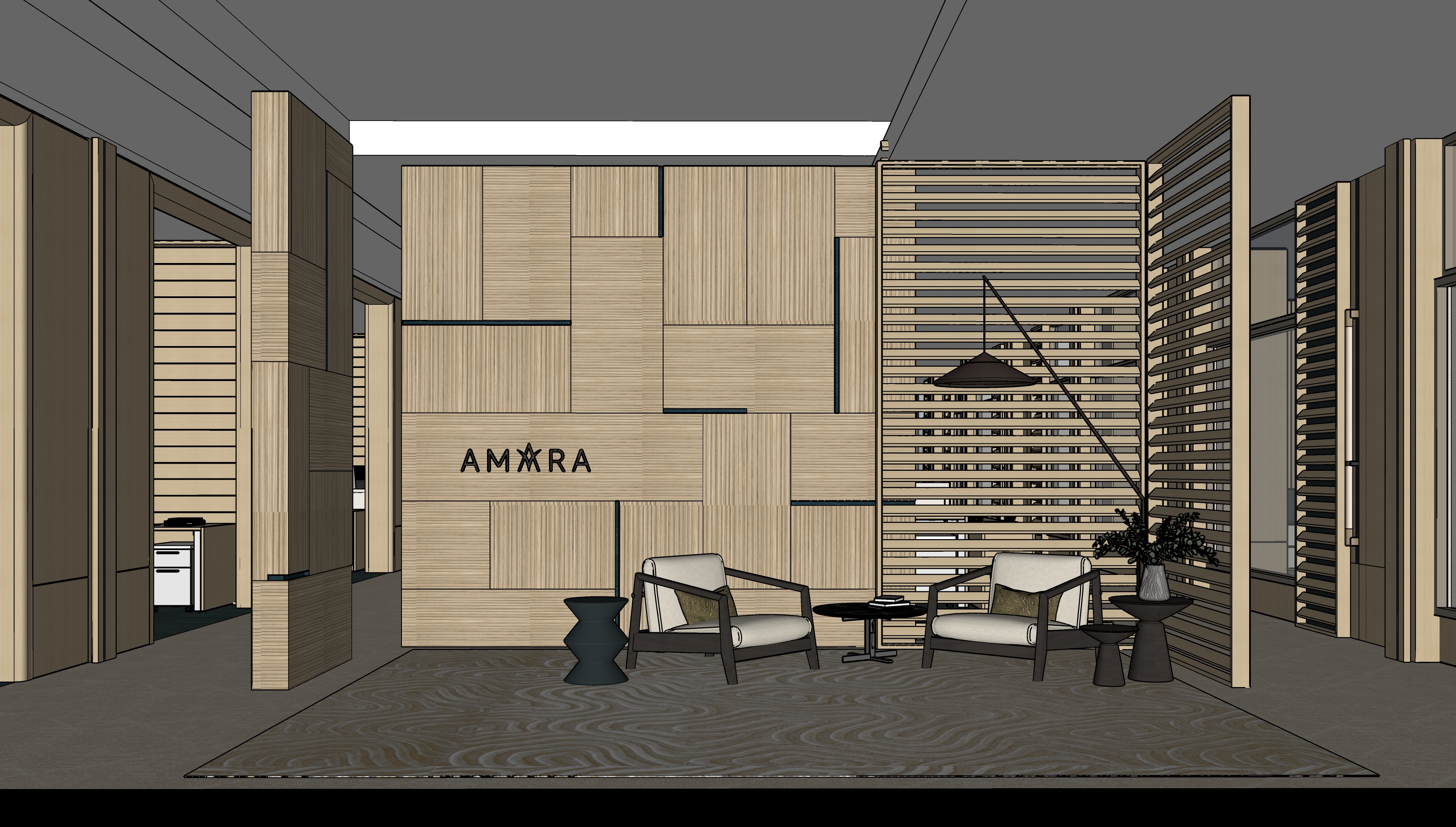 maintain all the materials the feature wall is in texture line laminate finish amara logo to be backlit cove lighting on both sides of the recessed ceiling located at the middle of the render soft sunlight illuminating the space from both sides of the space