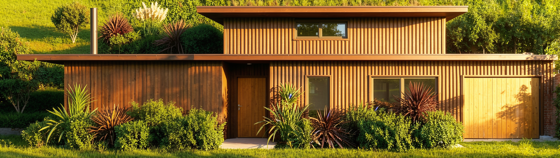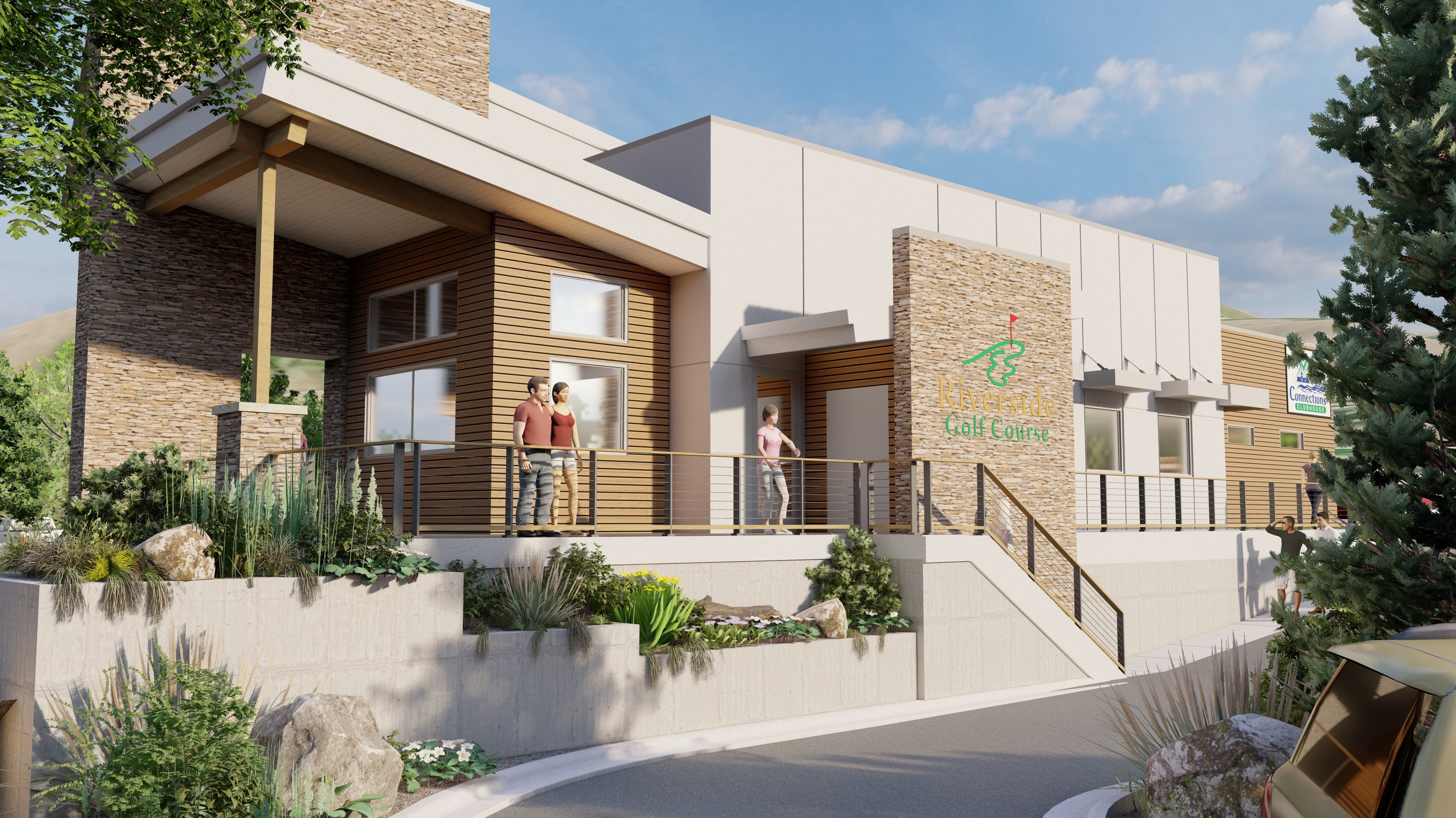 create a scenic architectural render of a modern golf course clubhouse the building features light beige stone walls complemented by warm wooden paneling the atmosphere is sunny with a clear blue sky dotted with fluffy white clouds include vibrant green foliage and bushes around the base with a variety of flowering plants add a few people casually walking on the pathway wearing summer clothing in light pastels capture the warm inviting ambiance with soft sunlight casting natural shadows across the scene