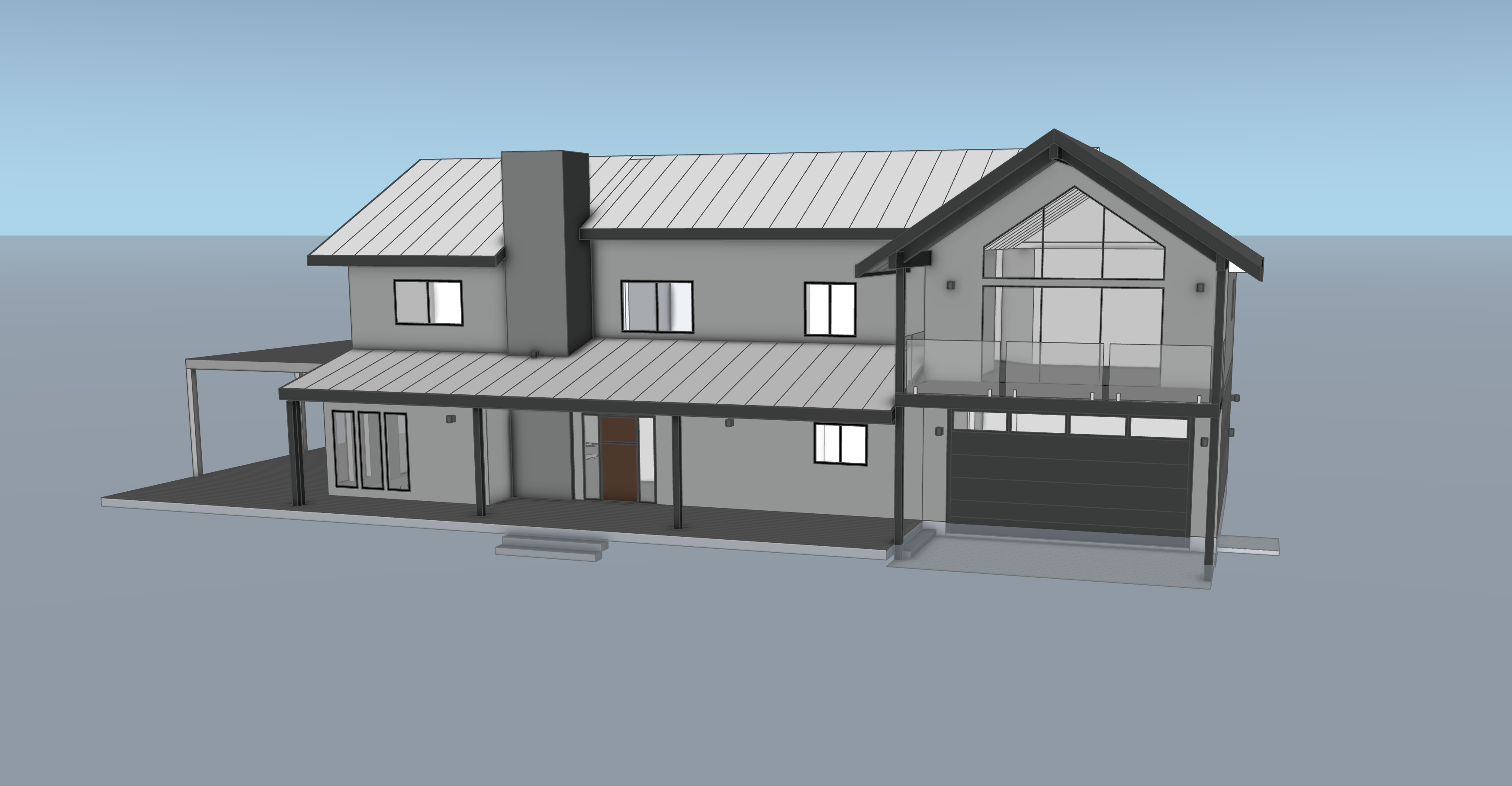 exterior shot redner this house in the forest exterior posts and beams to be black steel black window frames ledgestone on the chimney steel roof dark mahogany stain vertical wood siding front porch is a deck concrete slab in front of the garage door modern accents where possible lets go with lean in front of the deck and a driveway leading to the garage door architecture