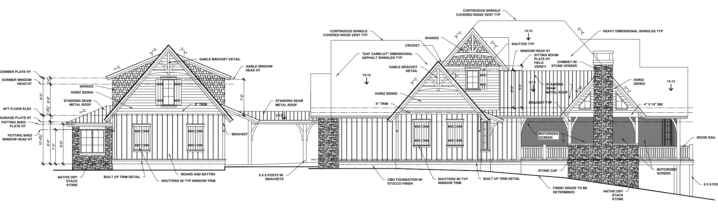 north carolina mountain home setting in dense pines and hardwoods blue sky and clouds native stone on chimneys foundation and accent areas indicated medium tone siding with dark eaves and windows foreground landscape and background mountain view