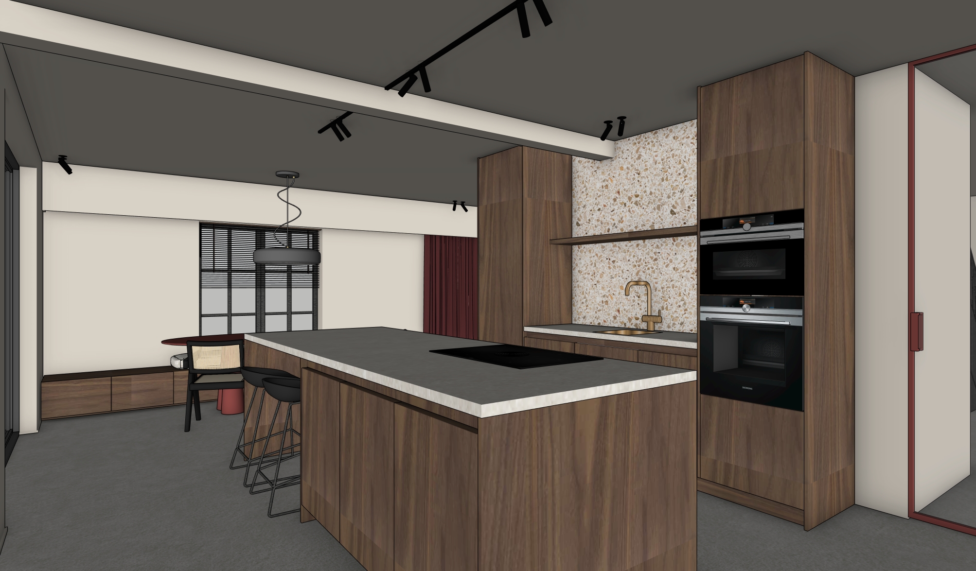maak een ultra hoogwaardige fotorealistische architecturale interieur render op basis van de ge ploade referentieafbeelding de volledige ruimtelijke indeling afmetingen verhoudingen zichtlijnen architecturale opbouw materiaalplaatsing meubels camerapositie kijkhoek perspectief en compositie moeten 100 identiek blijven aan de referentieafbeelding er mag geen herontwerp herschaling of herpositionering van elementen plaatsvinden dit is een materiaal licht en sfeerupgrade geen herinterpretatie architectuur materialen exact behouden vloer grote keramische tegel 90 90 cm kleur greige zeer subtiele voeg satijnmat natuurgetrouw mineraal karakter wanden kolommen plafond alle wanden volumes en plafonds in farrow ball white tie zachte warme off white kalkachtige verfijnde muurverflook licht absorberend niet glanzend geen zichtbare textuurherhaling keukenmeubilair maatwerk houttint decolegno poro noce ls40 warme diepe walnoottint zichtbare houtnerf satijnmat gelakt fineer geen oranje geen rood geen te donkere walnut keukeneiland vorm maat en positie identiek aan referentie fronten in decolegno poro noce ls40 massief en monolithisch volume bovenblad marazzi berici bianco satijn afwerking zachte kalksteenlook geen hoogglans geen betonlook kookplaat bora puxu vlakbouw volledig ge ntegreerd zwart glas spatwand nis spatwand terrazzo zoals referentie satijn afwerking fijne steentjes warm beige greige spectrum geen glans geen grove chips legboord in walnootfineer ls40 led verlichting zowel boven als onder het legboord warm wit indirect zachte wall wash kranen spoelbak kraanwerk koper geborsteld spoelbak koper onderbouw ge ntegreerd afdruigedeelte realistische metaalreflecties geen chrome look toestellen ovens siemens studioline strak ingebouwd zwart glas correcte schaal en verhoudingen stoelen stoelen exact behouden zoals referentie zelfde vorm kleur materiaal en plaatsing geen vervanging geen herinterpretatie ramen schrijnwerk glazen deur identiek rood behouden zwart raamkader lamellen aan raam bij eettafel in walnoot subtiele reflecties in het glas balk plafond balk in plafond exact behouden spots zwart identieke positie moeten zichtbaar licht geven zachte lichtbundels zichtbaar op wanden en vloer uitzicht context zicht naar buiten minimalistische tuin tussen open velden rustige groene texturen lage beplanting zachte diepte geen stadszicht geen bebouwing dichtbij licht buiten zacht diffuus realistisch daglicht belichting kritisch onderdeel natuurlijk zonlicht zacht warm diffuus realistische inval via ramen subtiele highlights op blad hout en vloer kunstlicht spots functioneel zichtbaar licht led boven en onder legboord warm indirect subtiele gelaagdheid tussen daglicht en kunstlicht geen vlak licht geen overbelichting geen harde schaduwen high end interieurfotografie sfeer renderkwaliteit materiaalgedrag ultra fotorealistische high end architecturale visualisatie 4k kwaliteit physically based rendering pbr correcte ruwheden reflecties micro schaduwen lichtabsorptie zichtbare houtnerf in ls40 mineraalstructuur in vloer en blad subtiele korrel in terrazzo realistisch metaalgedrag in koper geen cgi look geen plastic materialen geen vlakke shaders camera compositie professionele architecturale interieurfotografie full frame camera look brandpuntsafstand 24 28 mm rechte verticalen geen groothoekvervorming camerastandpunt exact zoals referentie identieke kadrering en perspectief subtiele realistische scherpte sfeer uitstraling warm rustig residentieel high end architecturaal maatwerk tijdloos zacht maar luxueus natuurlijke elegantie hotel suite kwaliteit negatieve prompt altijd toevoegen vermijd cgi look renderachtige uitstraling illustratie schetsstijl cartoonstijl game engine look kunstmatige belichting vlak licht harde schaduwen overbelichting onderbelichting overscherping blur ruis verkeerde houtkleur te rood hout te donker hout fout walnoottype fout terrazzo grove terrazzo glanzende muren betonlook verkeerde tegelmaat fout perspectief vervormde verhoudingen plastic textiel foutieve metalen chrome kraan rommel mensen extra decoratie visuele chaos