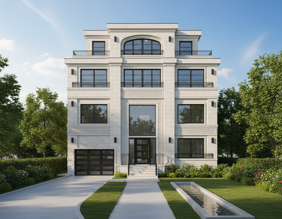 create the side of the house and add a three car garage attached remove the flat roof and all three windows under the flat roof replace the small window on the side of the house with a large window move the chimney to the other side of the house
