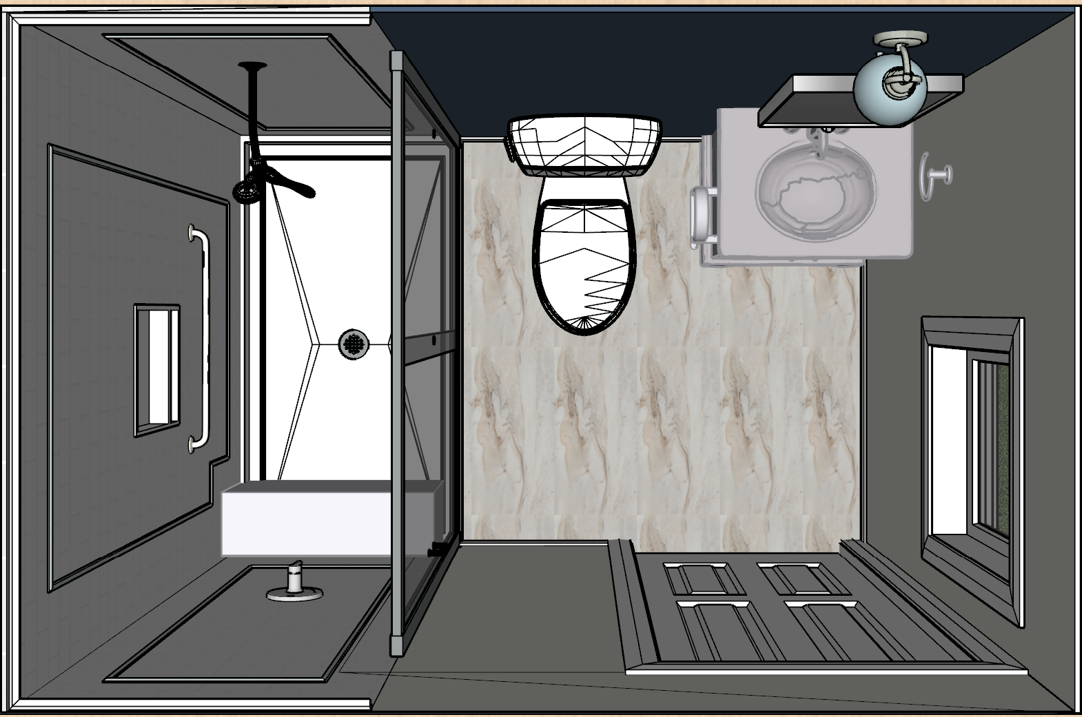 shower walls are subway tile with light blue frame shadow box the niche is on the left wall only the top wall is hale navy and the other walls are steam by benjamin moore the floor is a calcutta marble style luxury vinyl tile 12 x24 in a brick pattern