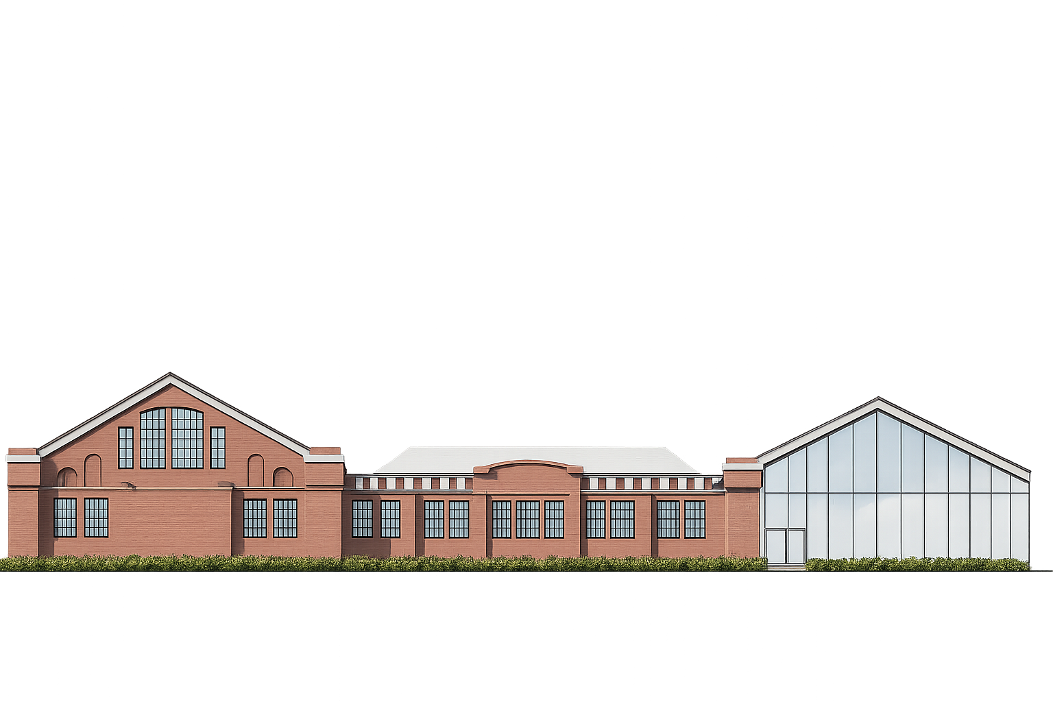 a beautifully rendered architectural illustration showing a classic building design the building has a rich red brick facade with large elegant windows framed in black the roof is a soft white contrasting beautifully with the brick the rightmost section features a modern glass structure with a light blue tint creating a harmonious blend of traditional and contemporary design lush green shrubs border the base adding vibrancy the background has a gradient from soft gray at the bottom to deep black at the top creating a striking focal point the atmosphere is serene and sophisticated highlighting the building s architectural charm