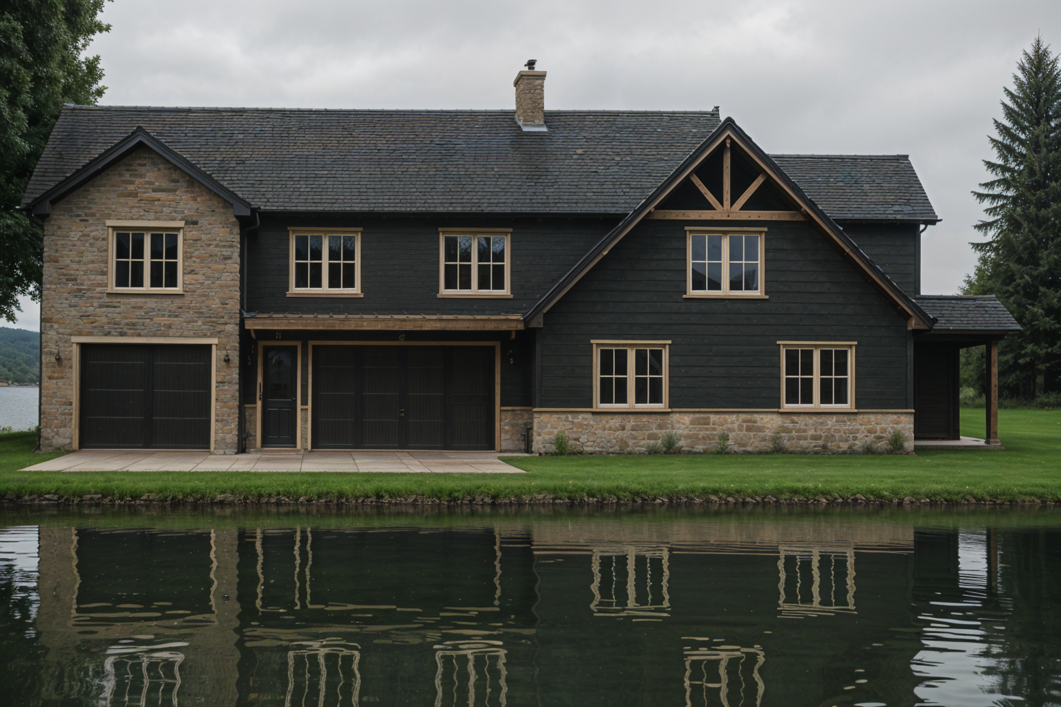 change the siding to a light blue gray color and make the windows white with white trim on doors and windows