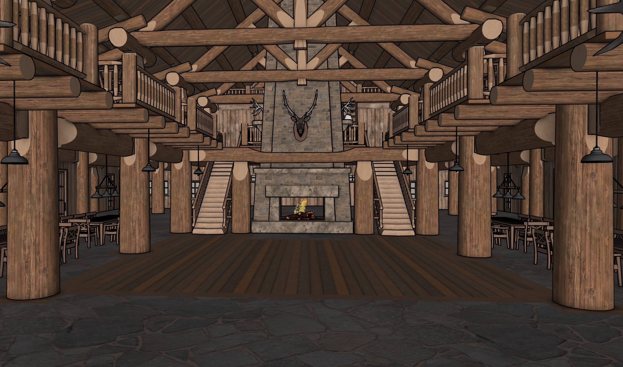 rustic lodge with a cozy atmosphere render with a rich cedar brown for the timber and log supports and a deep burnt sienna for the ceiling paneling the stone base and pathway should be in a natural gray flagstone hue put a fire in the fireplace and people at the tables make it nighttime