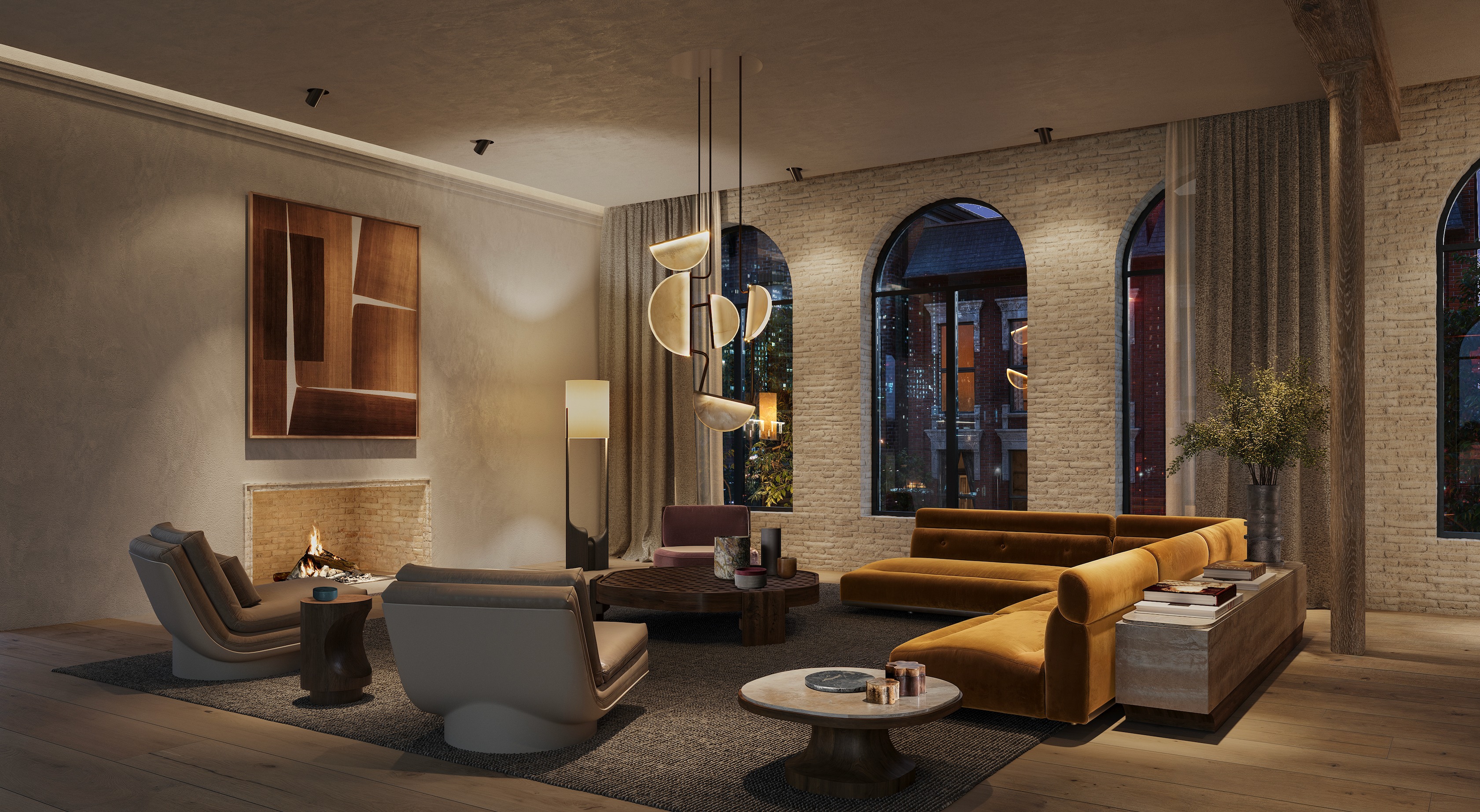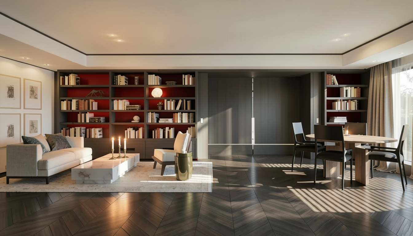 convert to day light remove chandelier replace artwork by the one in reference image replace side table between 2 arm chairs by the one in reference image