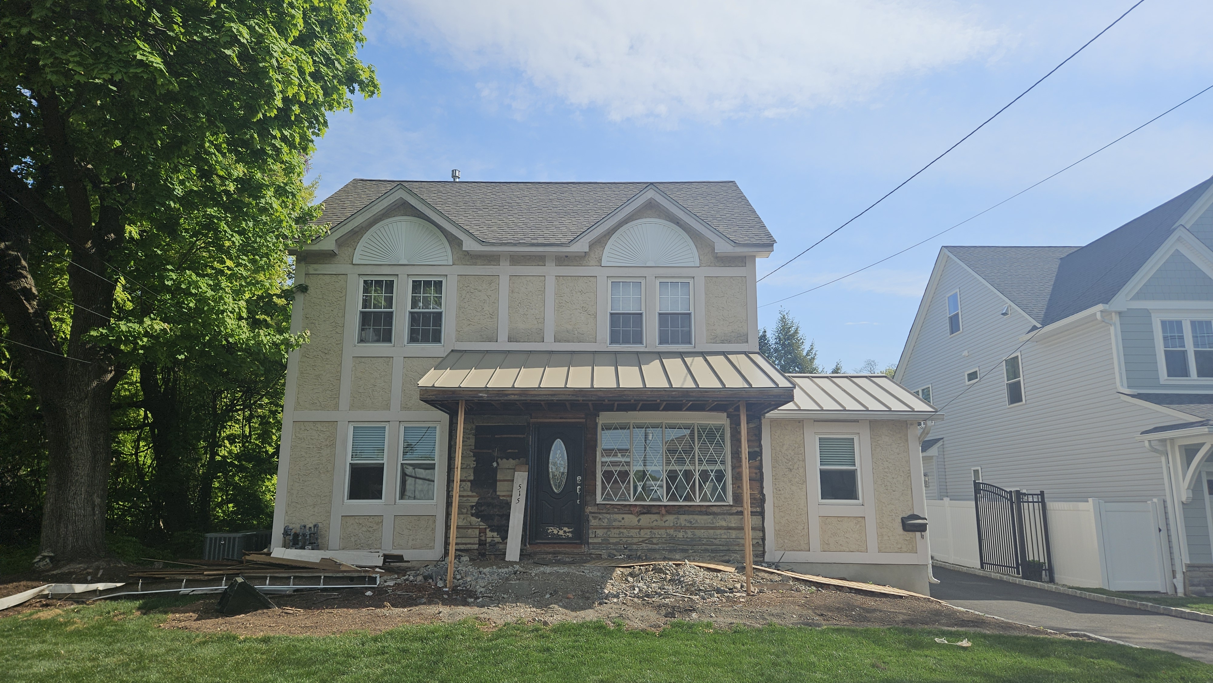 modernist exterior shot modern farmhouse set in a residential neighborhood with trees in the background porch shall have gray stone veneer with stone water table on each side of porch rest of house should have horizontal siding architecture