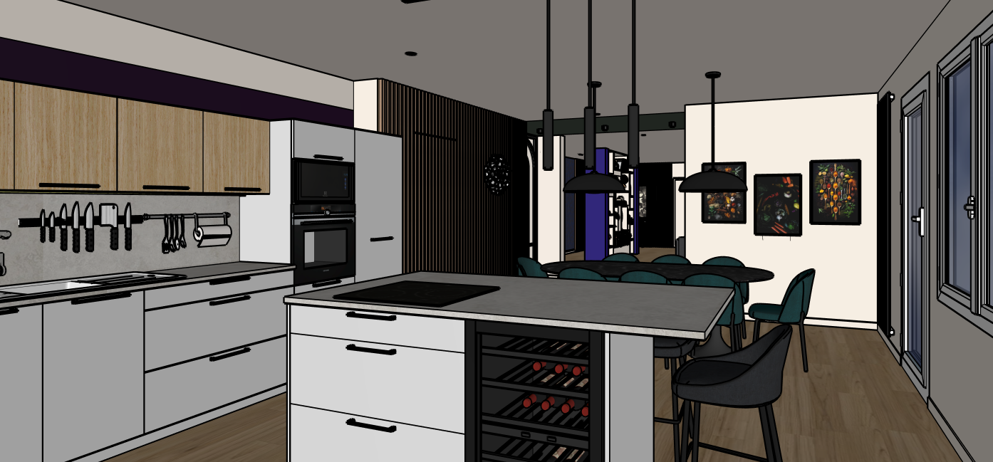 lumi re naturelle droite de la photo sol en ch ne clair droit plan cr dence cuisine en finition travertin gris clair lumi re jour droite eclairage spots et suspensions table de salle manger marbre noir chaises de salle manger vert sapin chaise c t de la cave vin gris anthracite tasseaux bois coloris ch ne clair radiateur existants blanc
