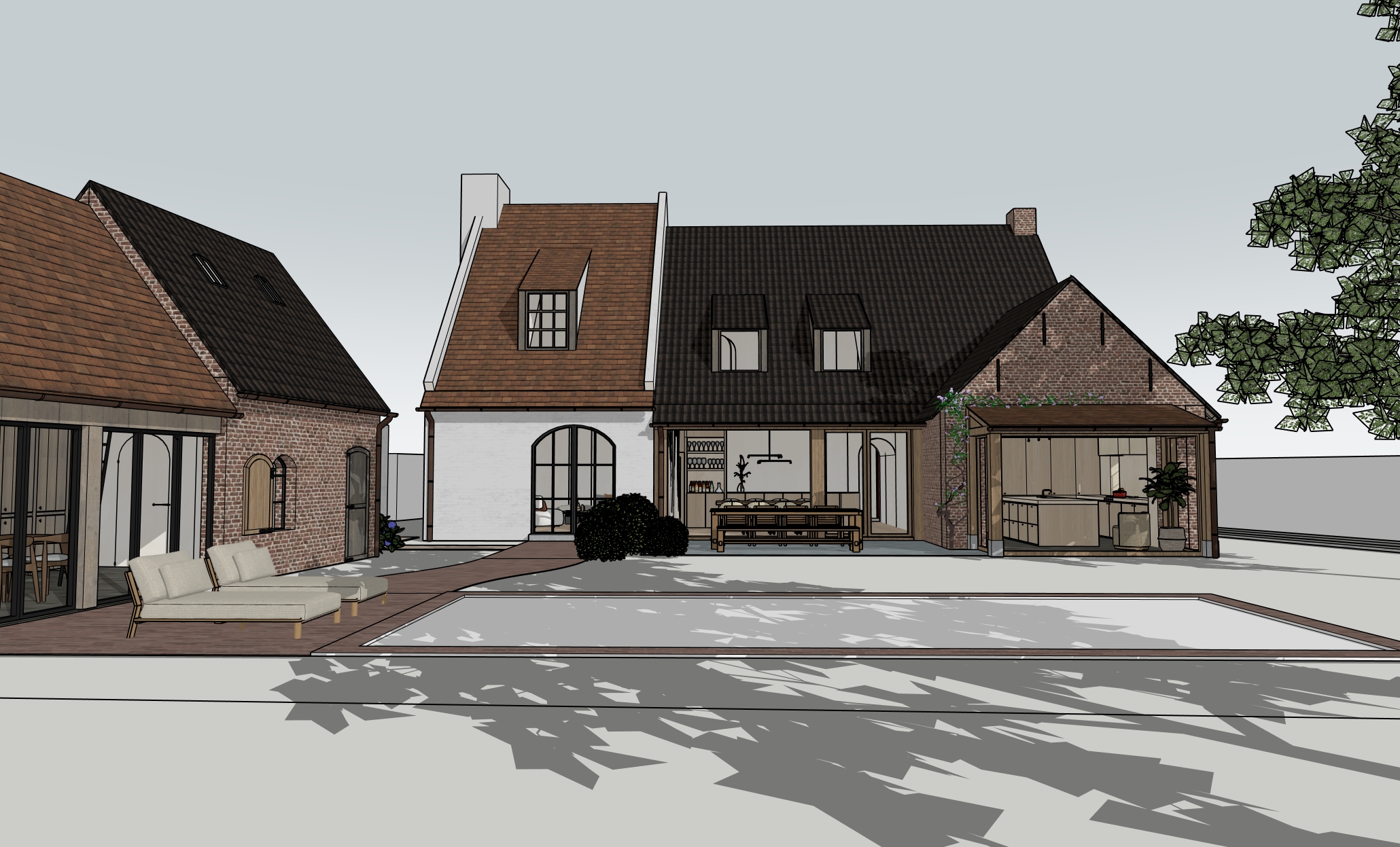 a villa set in a natural environment with a few trees in the background the right building consists of two architectural finishes one part with white limewashed walls and one part built with handmade brick the limewashed section has a roof with red rustic clay tiles while the handmade brick section has a dark grey roof tile the left building is entirely built with handmade brick and features two different roof types a swimming pool is present in the outdoor space surrounded by natural grass preserve all materials architectural compositions and proportions create a cozy warm and inviting exterior scene with soft natural lighting and a harmonious natural atmosphere