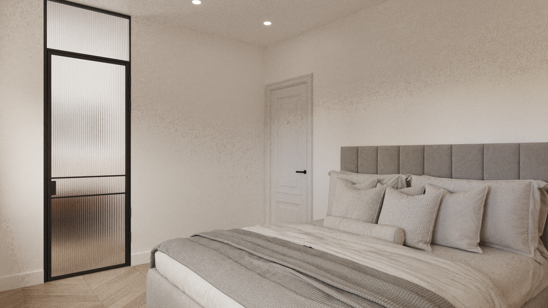 serene minimalist bedroom interior with white matte walls and warm oak chevron inglete parquet floor soft natural daylight composition similar to a refined boutique hotel room centered upholstered headboard wall with bed dressed in copper and warm earthy brown linens and cushions in natural linen textures layered throws in soft taupe and beige calm and cozy atmosphere harmonious neutral palette of white copper warm browns and soft taupe natural materials and tactile textiles photorealistic render high detail soft shadows 8k v ray lighting architecture