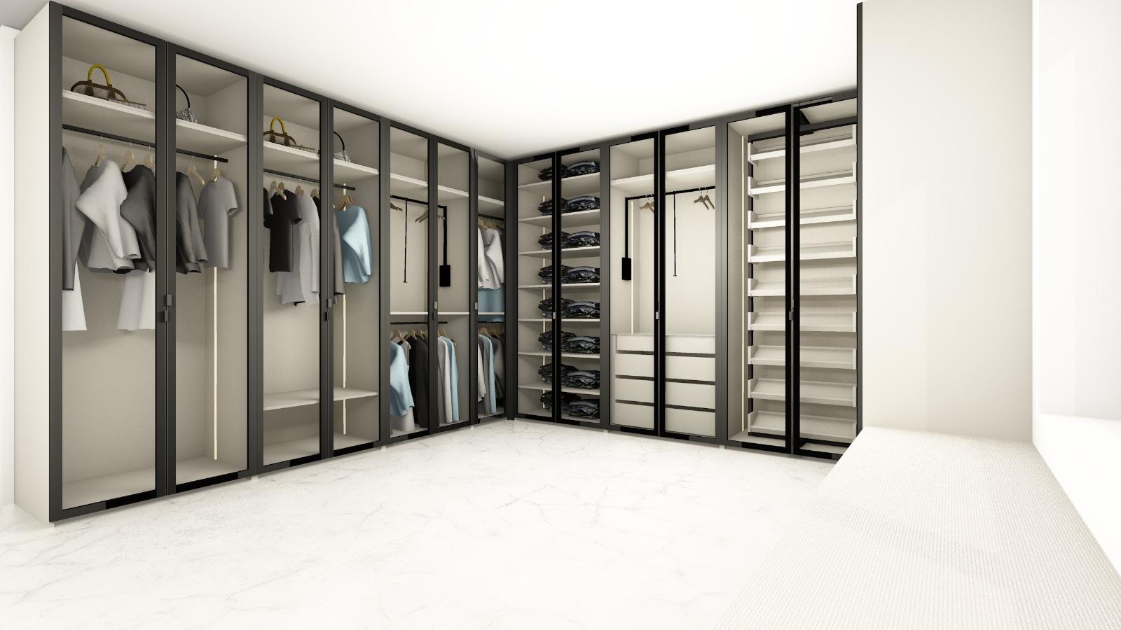 modern walk in closet led lights shoes on tha right side