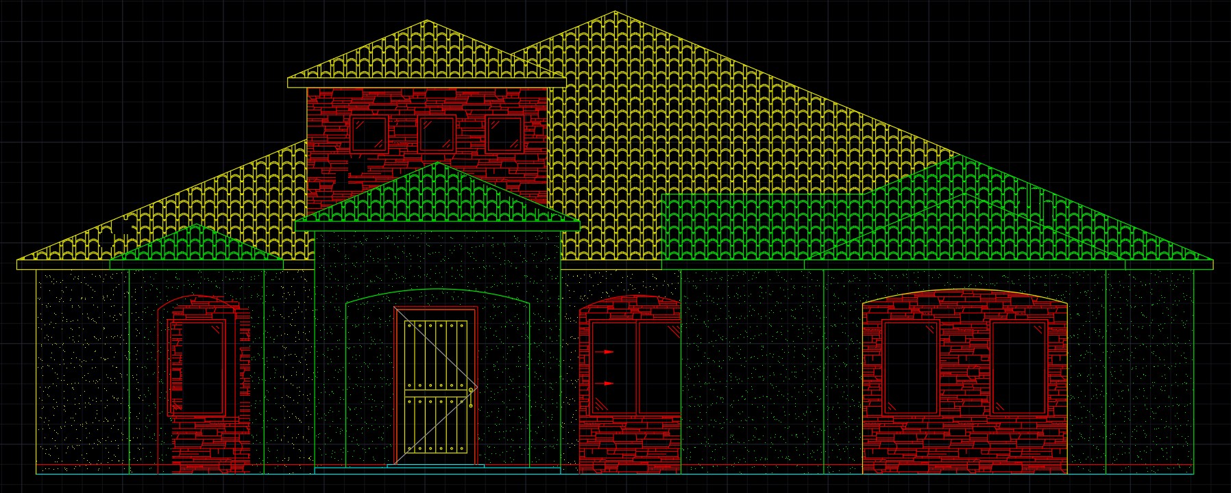generate beautiful elevation render with light inside with white stucco on front walls and black tile roof