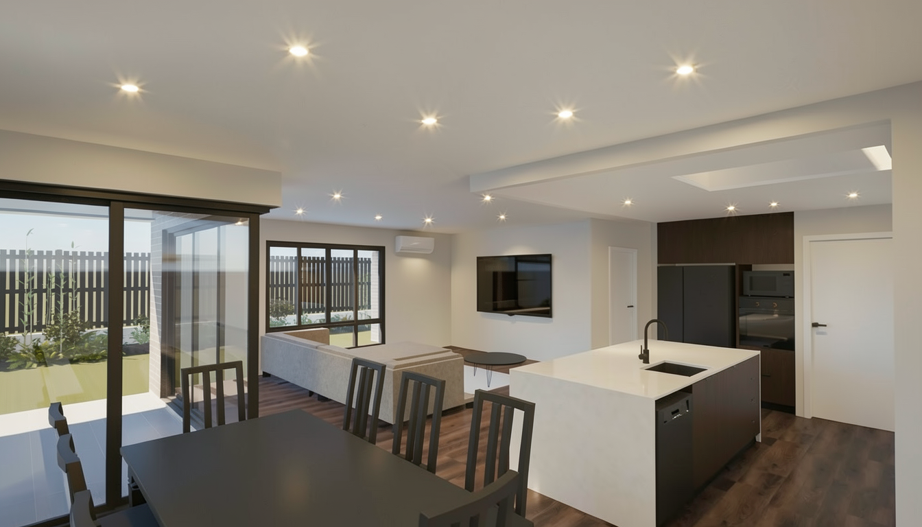 add downlights to ceiling and single led strip light under kitchen island benchtop only and led strip light to overhead cupboards above splashback only dont show anything stored on shelves