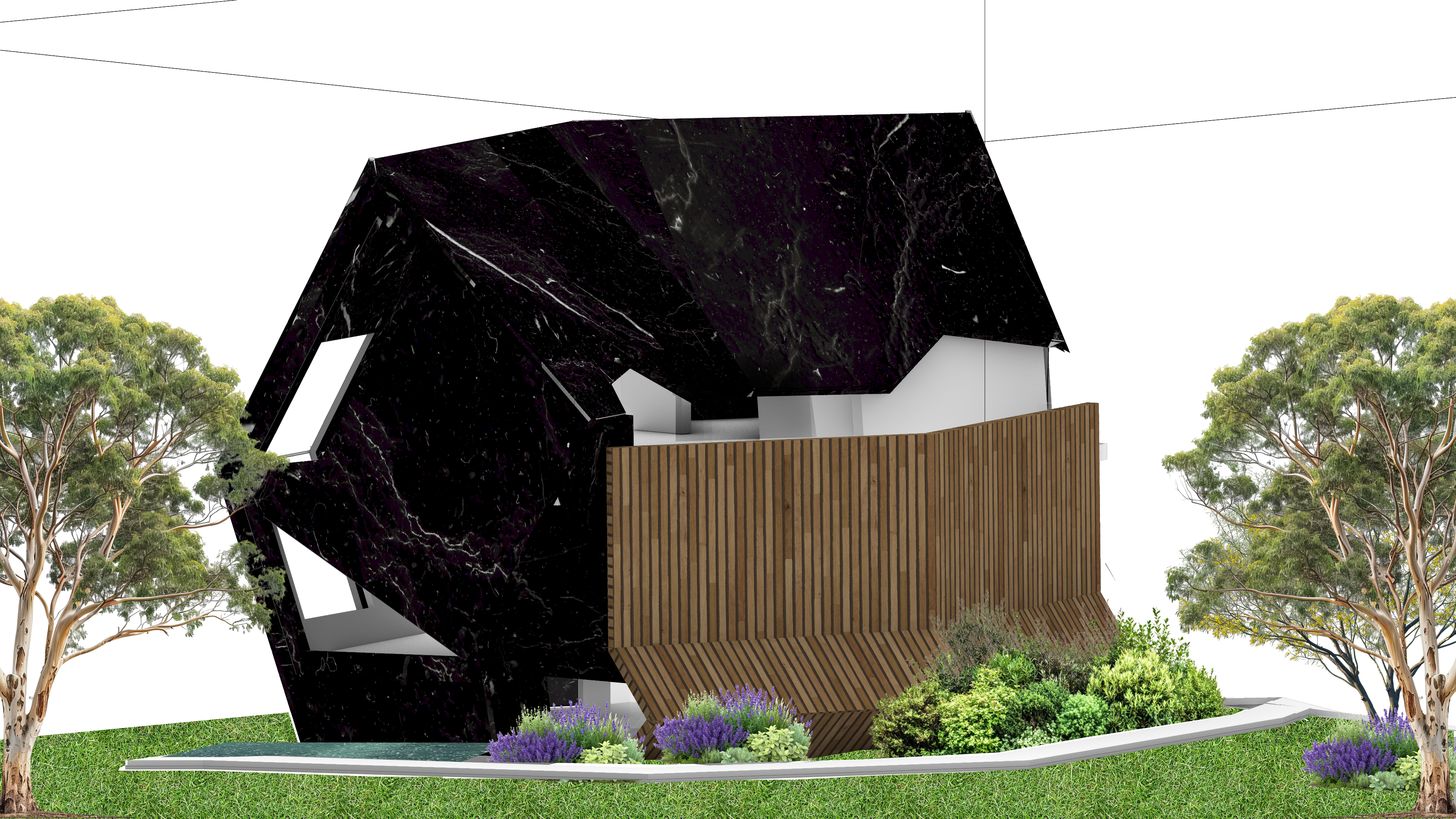 prompt exterior shot apply soft daylight with slight haze desaturated earthy tones and a cinematic mood emphasize minimalist composition muted colors and flat entourage silhouettes that blend graphically into the scene reduce hyper real reflections and glossiness adding subtle film grain for a photographic feel final image should feel like a conceptual architectural visualization calm atmospheric and editorial make windows clear and pool clear
