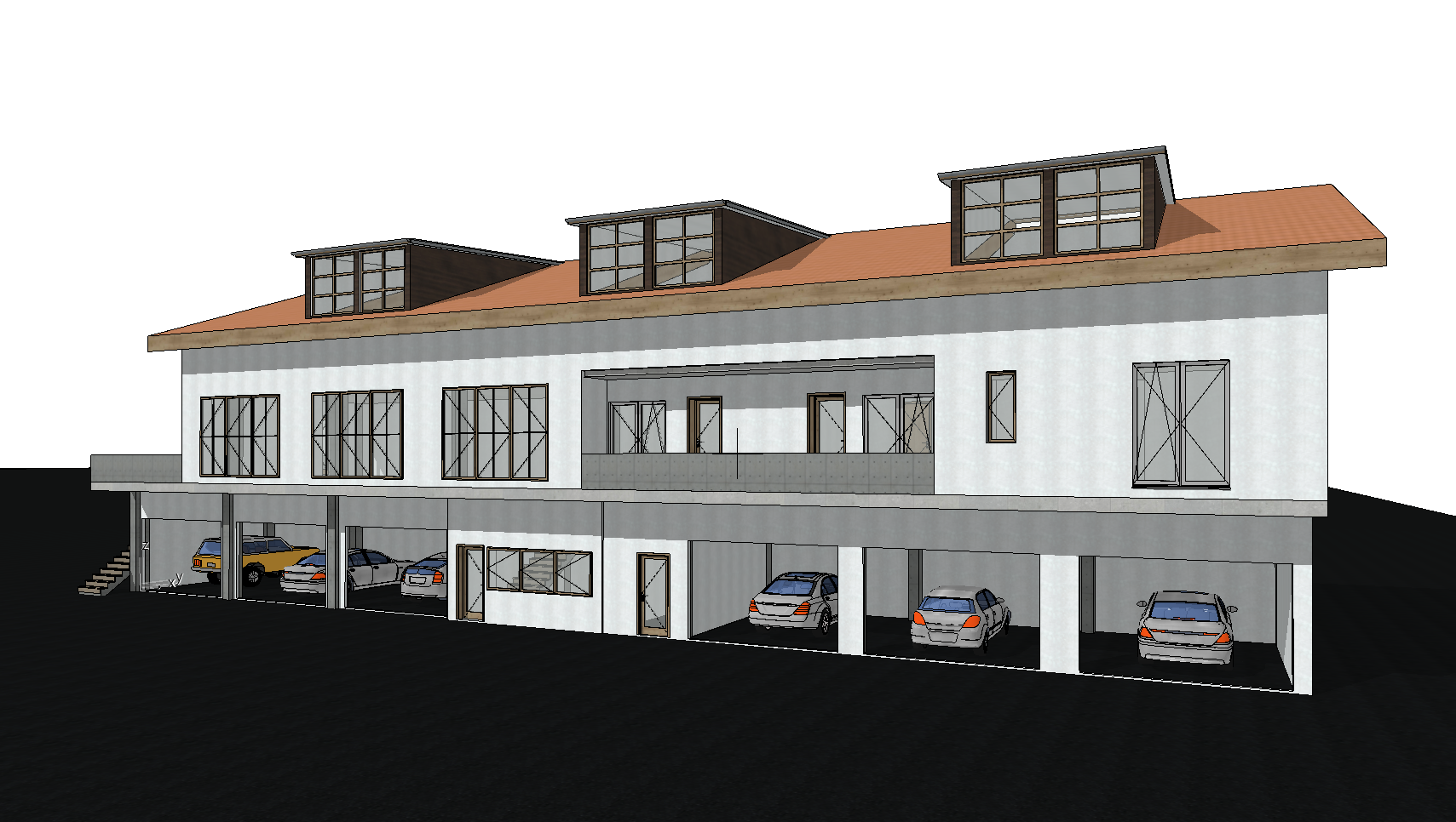 exterior shot car wash on ground floor appartments at the first floor